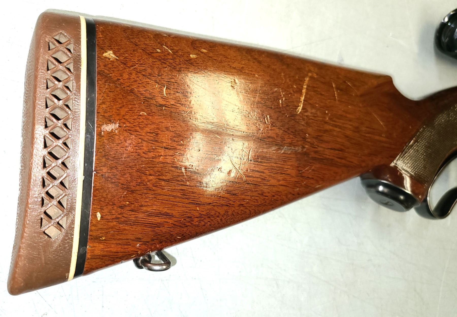 One piece nicely checkered wood stock, checkered pistol grip, White Line rubber