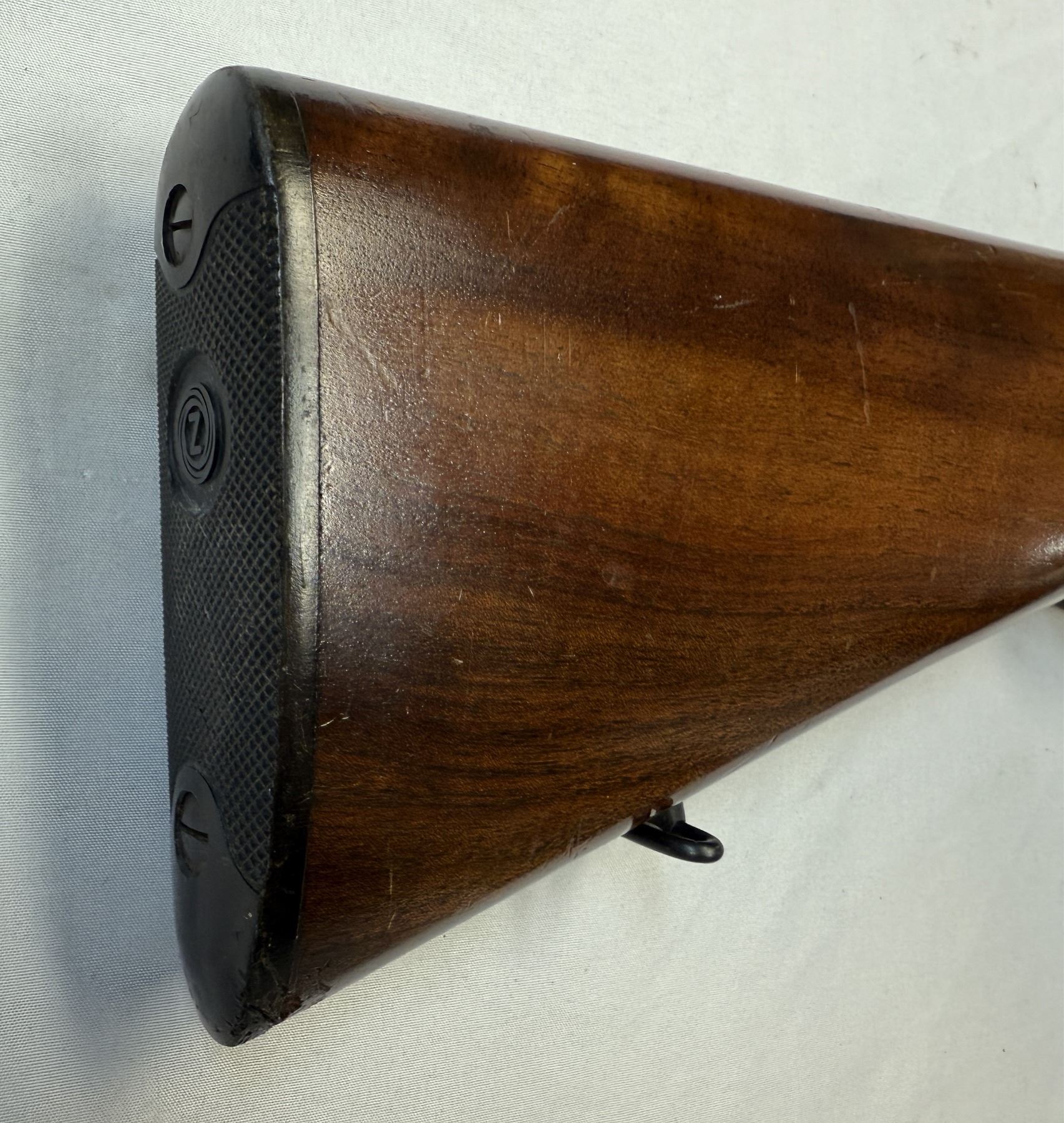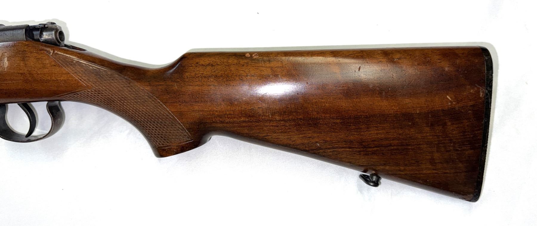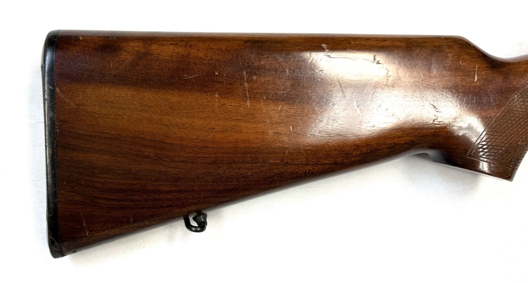 One piece nicely checkered wood stock, checkered pistol grip, original hard plastic