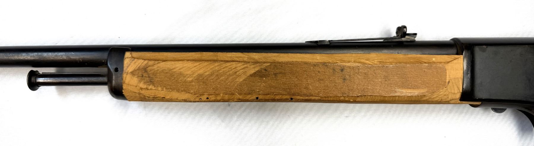 Rear wood stock has no cracks and appears to have original finish which is now worn.