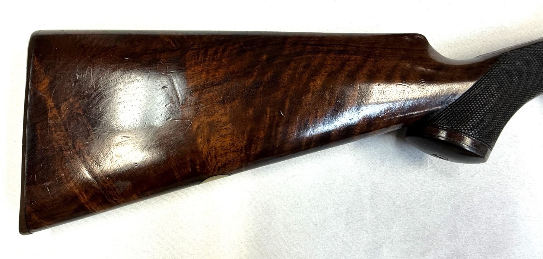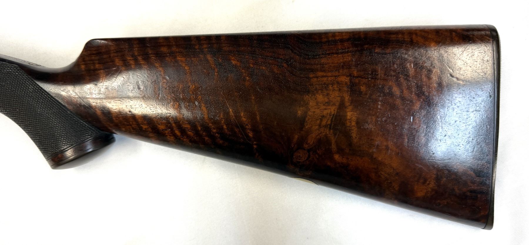 Rear Stock with checkered pistol grip. Steel buttplate. Silver ID plate.