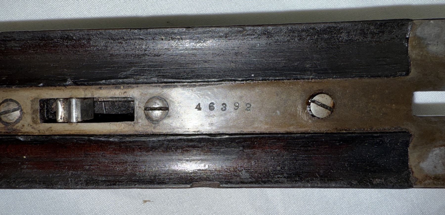 The top of the forend iron is marked 46395. The forend lever assembly is marked