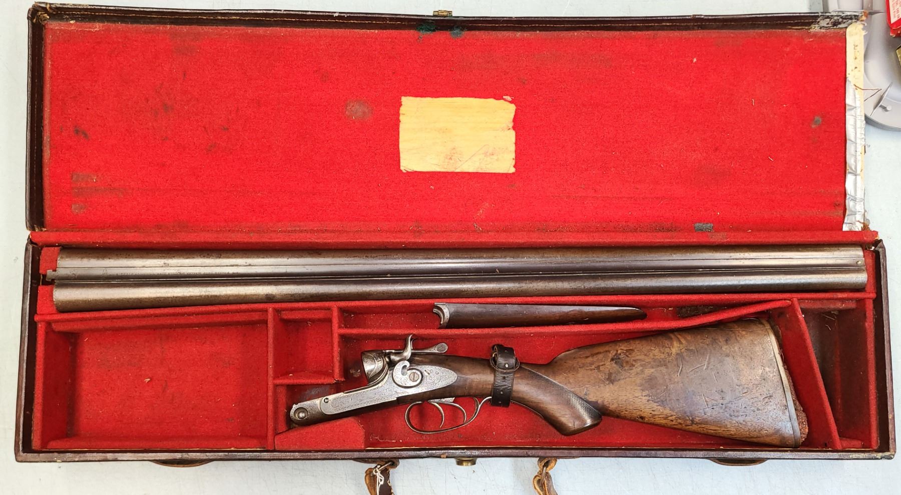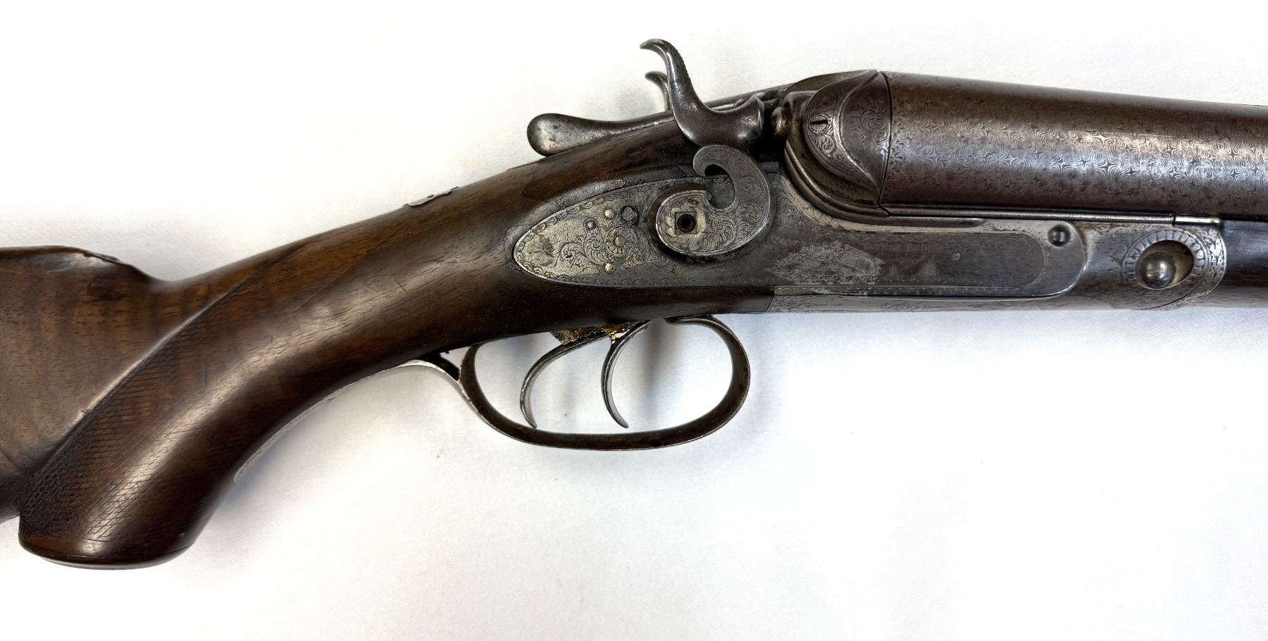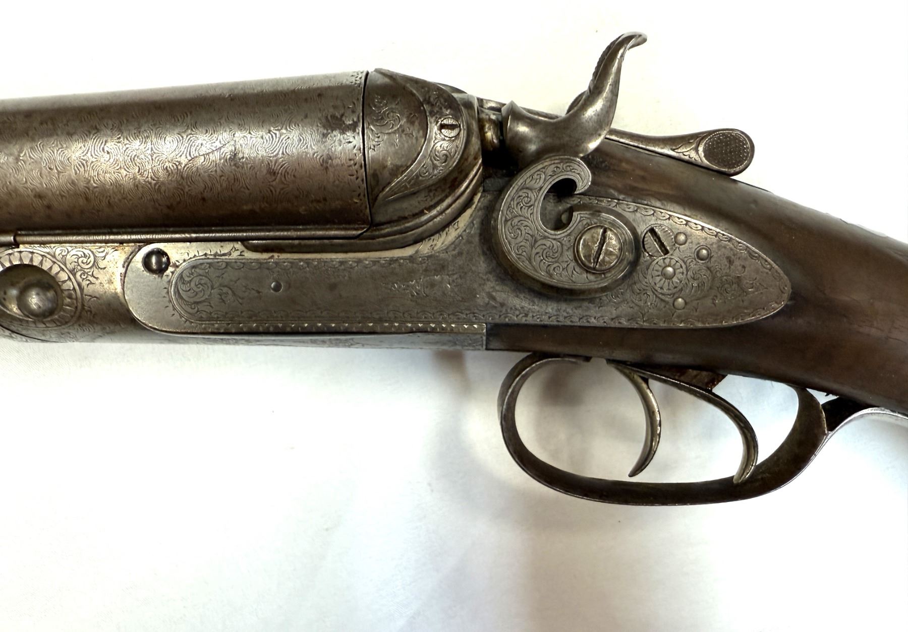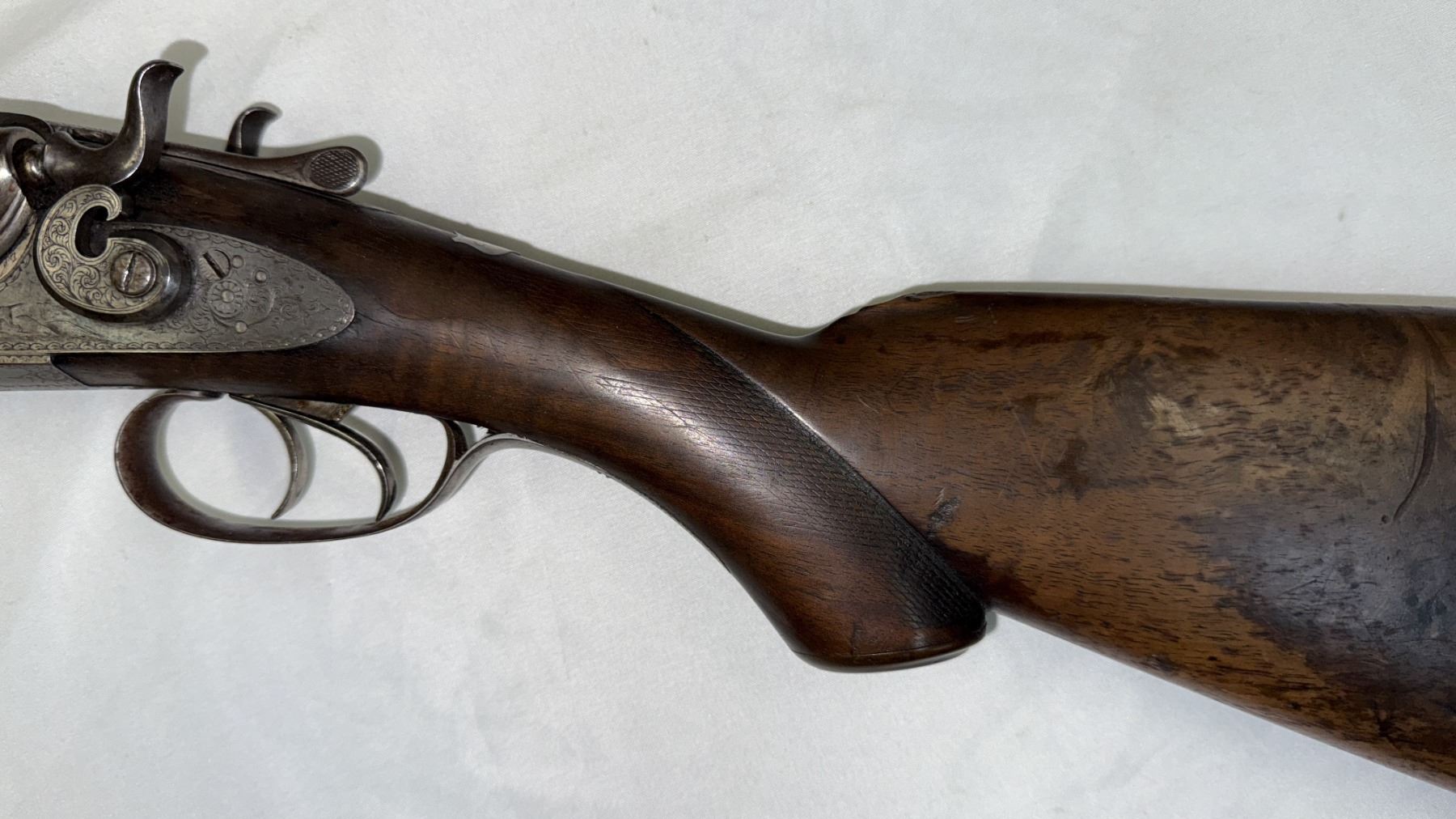 The action shows operational wear and the barrels lock up to the receiver with play.