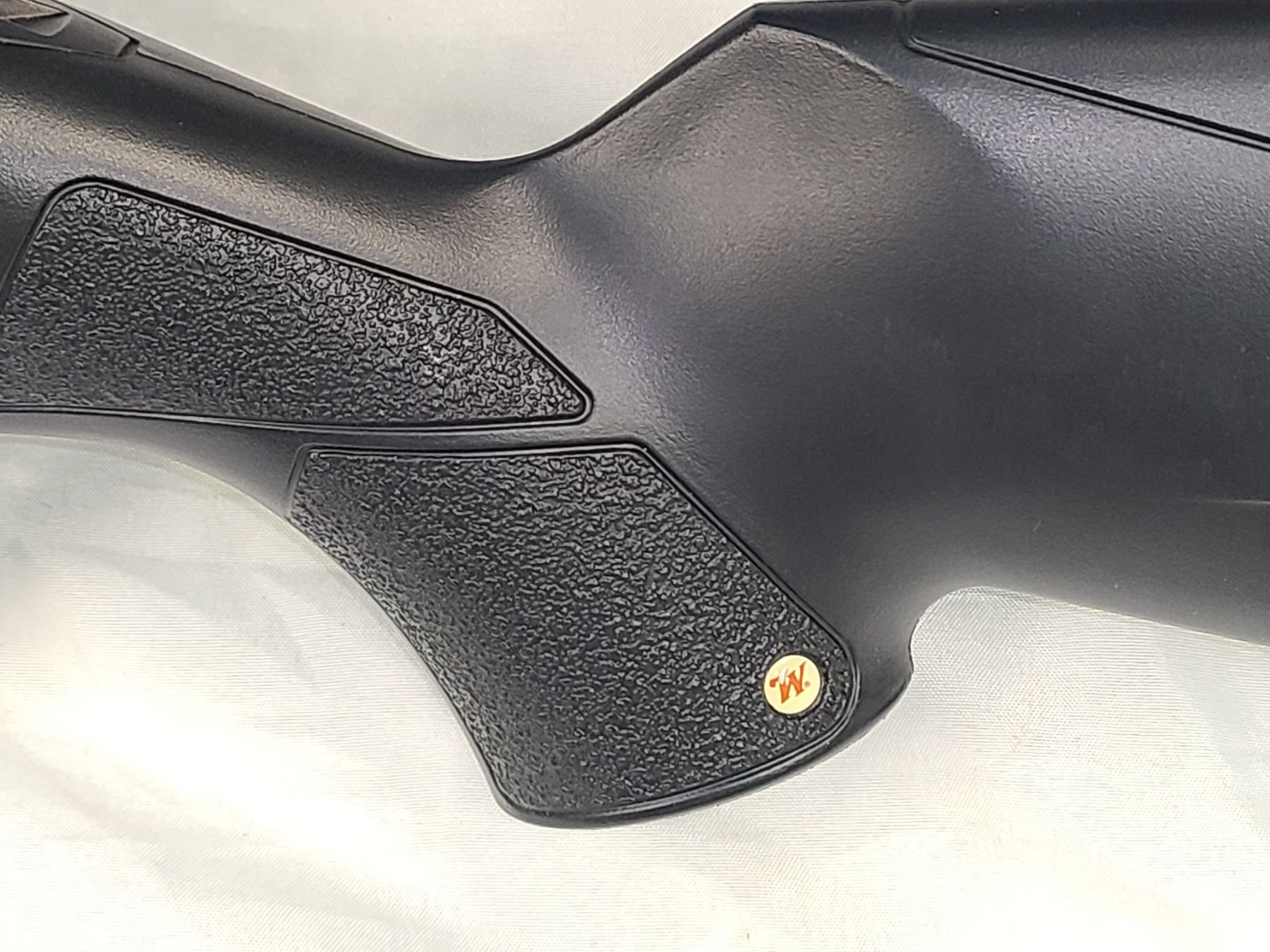 The black synthetic stock shows molded, textured grip panels in place of standard