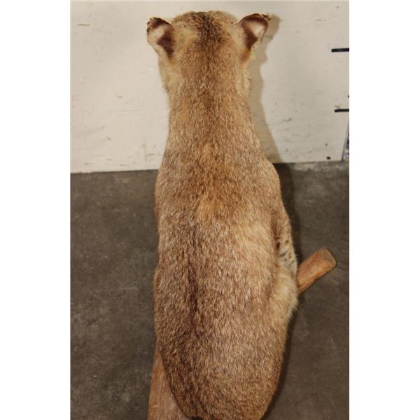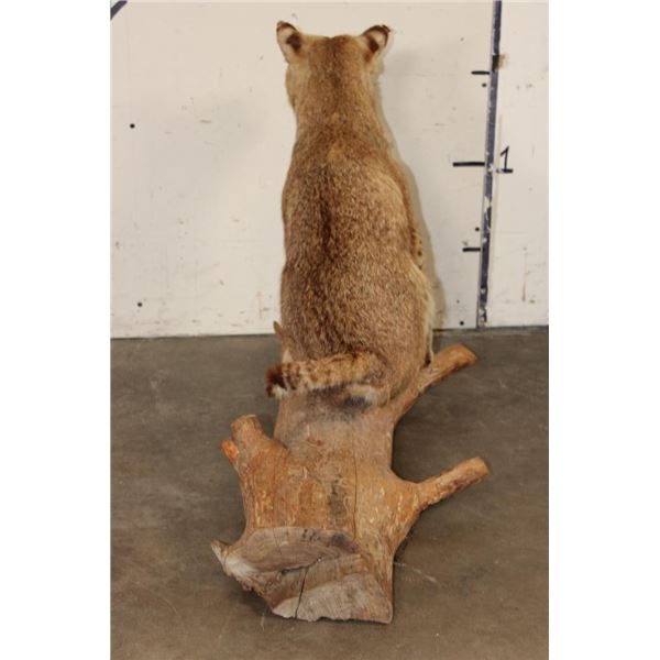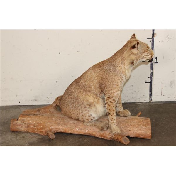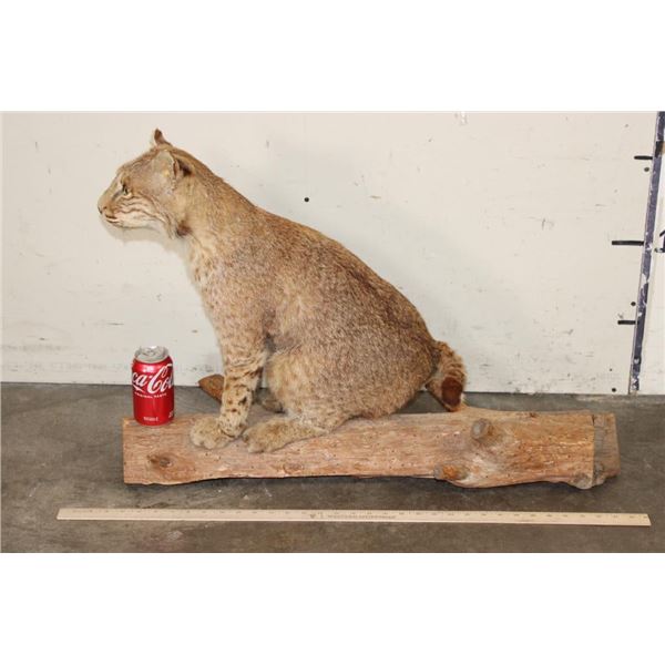 Life-sized BOBCAT Sitting on a Wood Log Base. He measures 33" Long x 14" Wide x 23" Tall. TAXIDERMY