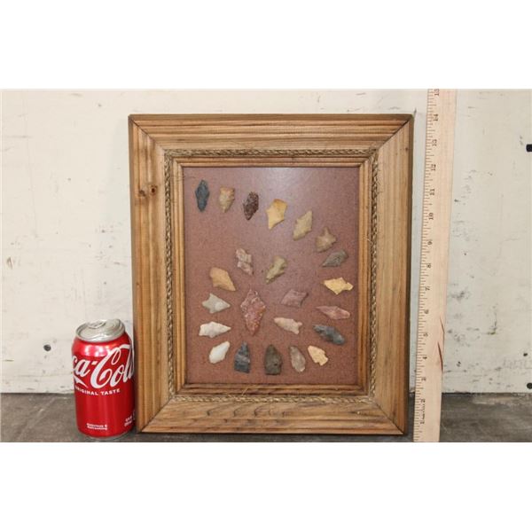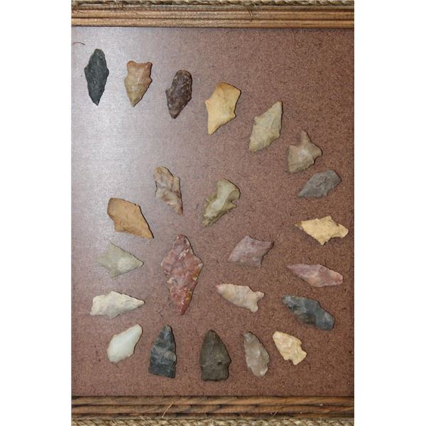 23 Ancient Pre-historic American Indian ARROWHEADS with Flint Points. These are from the Early Archaic Period (8,000-1000 BC) to the Woodland Period (1000 BC-1000 AD). They have been artfully displayed in a spiral within a 14" Tall x 12" Wide in a Wood Frame with No Glass. ARROWHEADS *While these arrowheads came from an estate of a long-time collector; we as the auction company are not going to get into a protracted discussion about age and authenticity. This collector has no paperwork or COA as to age or authenticity. While we believe the vast majority; if not all to be old; we are wholly uncomfortable with an argument with qualified and unqualified, alleged authorities. All of that to say; we are not guaranteeing age or authenticity*