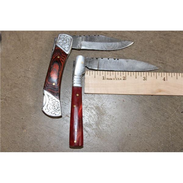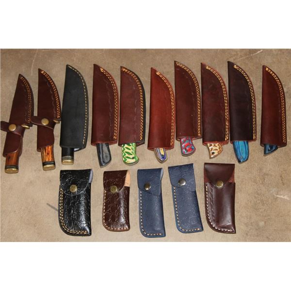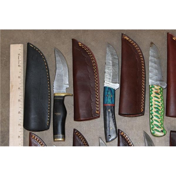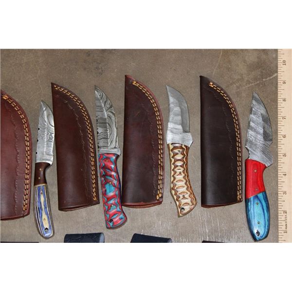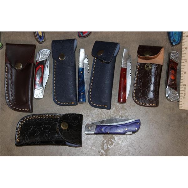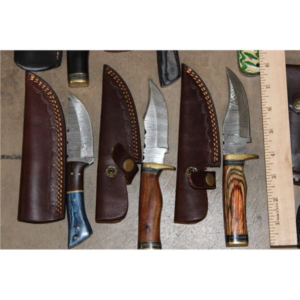 15 *New* Damascus Steel Knives with Leather Sheaths. There are 10 Fixed Blade and 5 Pocket Knives. Each have their own colorful and unique wooden handles. (ONE$) KNIVES