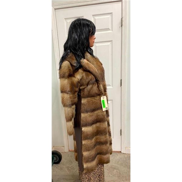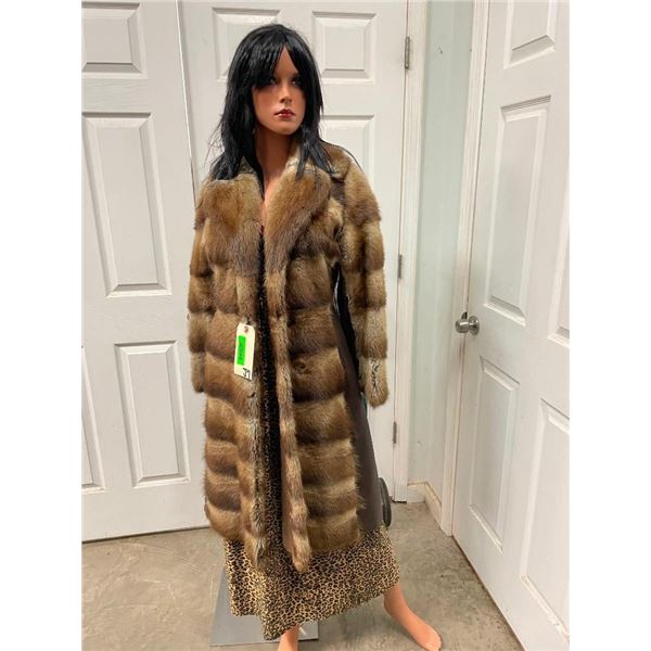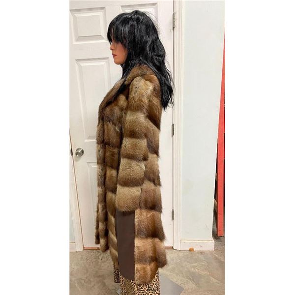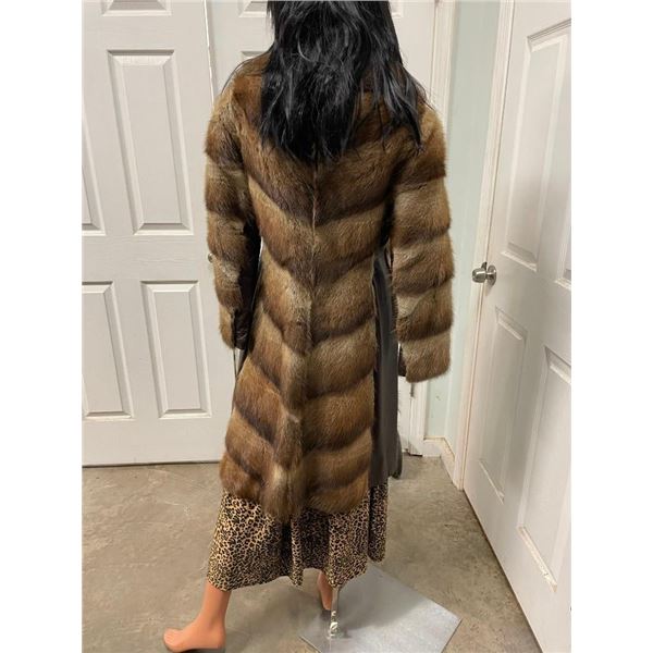 Beautiful natural MUSKRAT and LEATHER Patchwork Fur Coat. It is a Size Medium-Large. It measures 41" Long and 16" across the shoulders. Each Sleeve is 24" Long. TAXIDERMY CLOTHING FUR COATS AND JACKETS