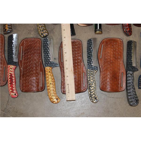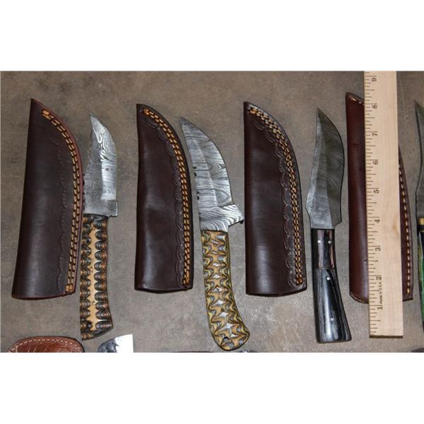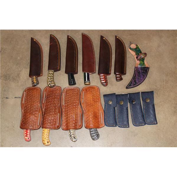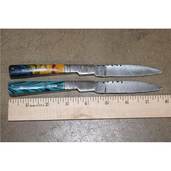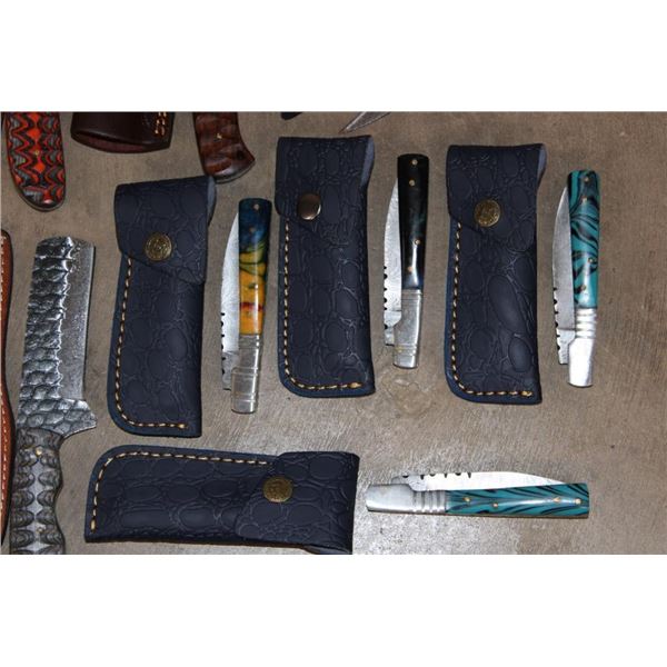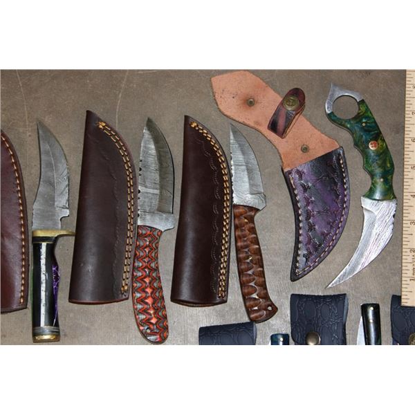 15 *New* Damascus Knives. There are 7 Fixed Blade and 4 Carbon Steel Knives. Each has a unique colorful wood or resin handle. (ONE$) FIXED BLADE AND POCKET KNIVES