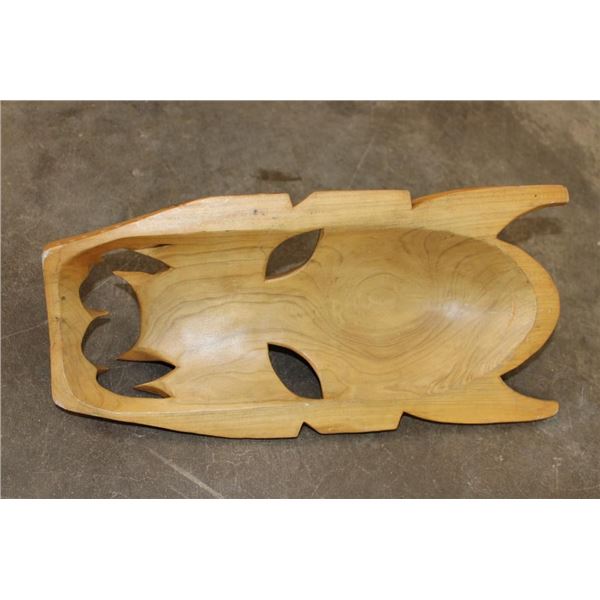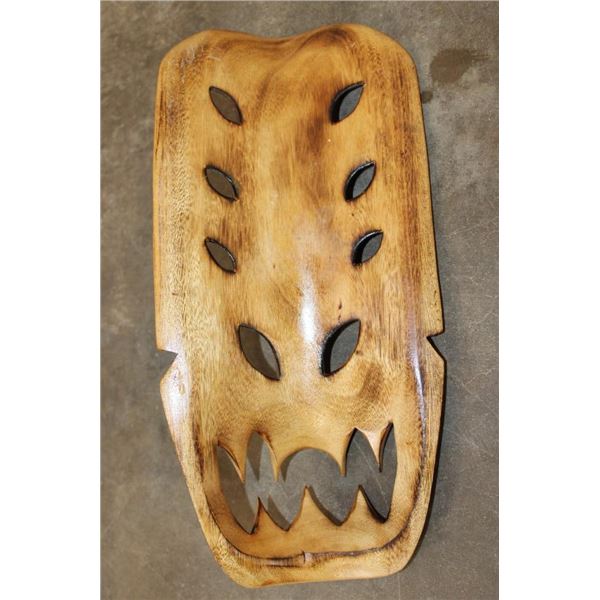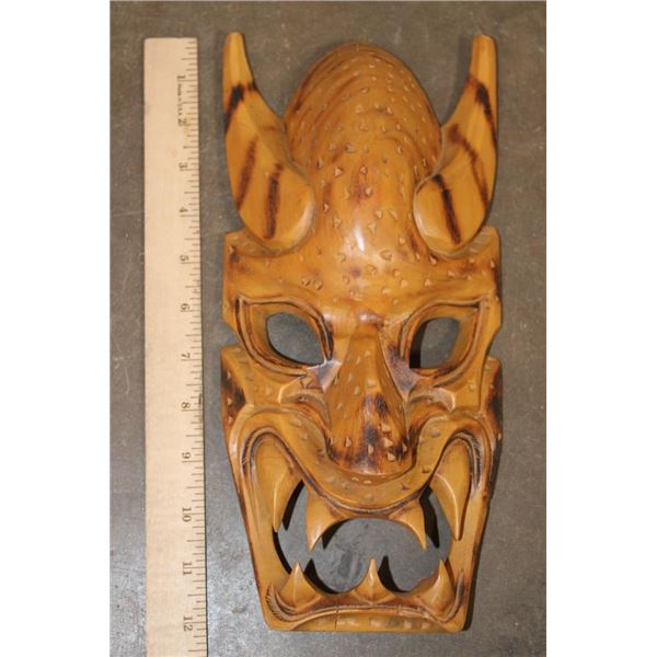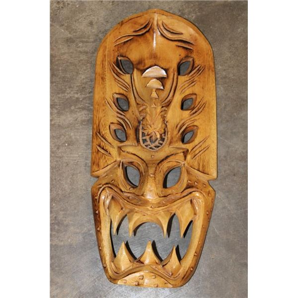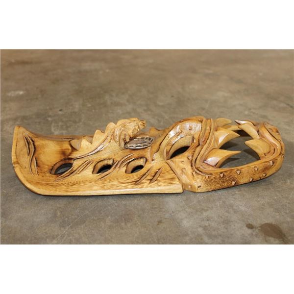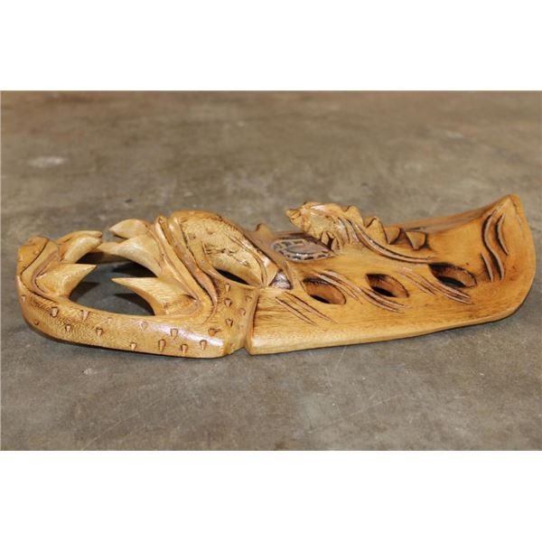 2 Vintage Hand-carved Wood Ifugao Tribe Demon Masks from the Philippines. The larger Mask measures 14.25" Tall x 7" Wide and the other measures 12" Tall x 5" Wide. The Total Weight is 1 lb 8 oz. These masks are described as "Bakunawa", a serpent-like dragon creature believed to defend against evil spirits. Perfect for collectors of tribal art and cultural enthusiasts. (ONE$) COLLECTIBLE ASIAN ART AND ARTIFACTS