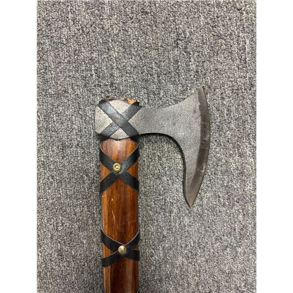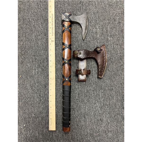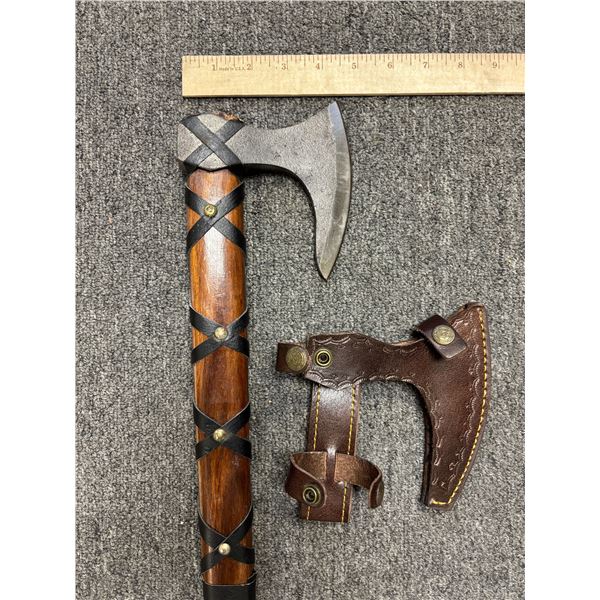 Contemporary Viking Battle AXE. It has a Leather Sheath and Belt Loops with Carbon Steel Blades. The wooden handle measures 18 5/8" Long and the Total Length is 19.75" Long. AXES AND MACHETES