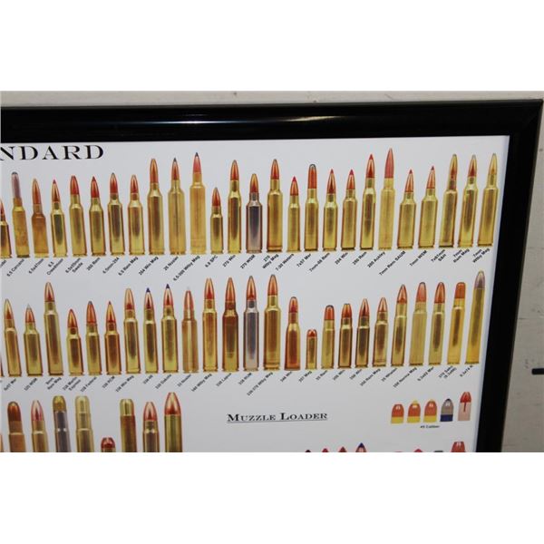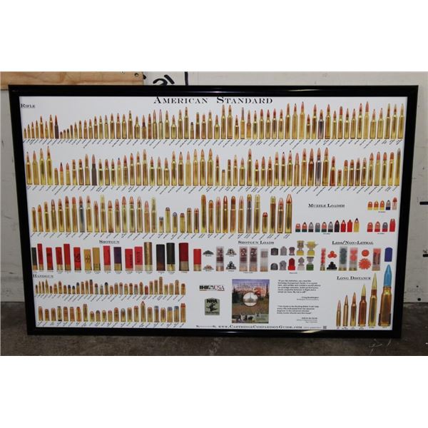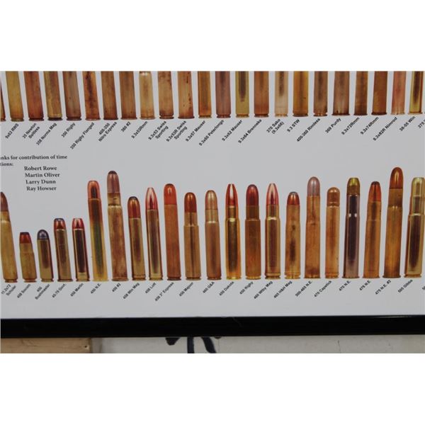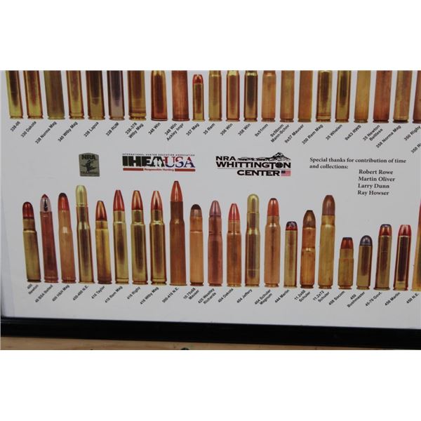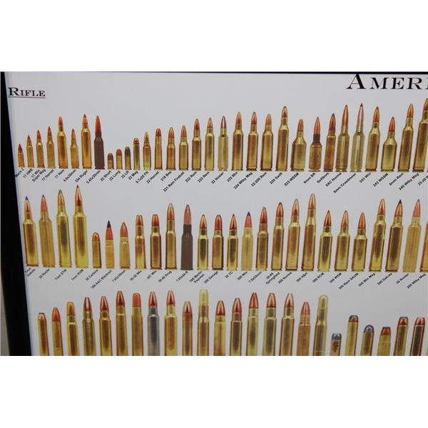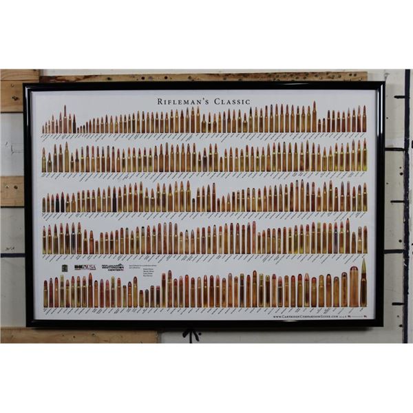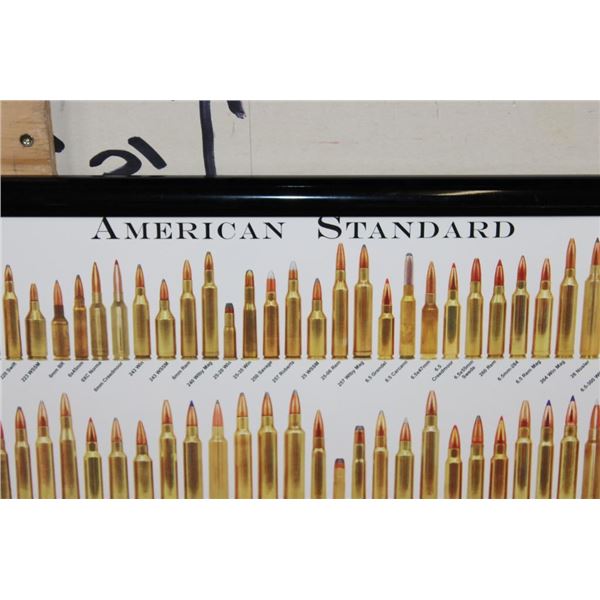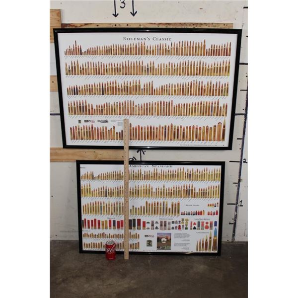 1 "Rifleman's Classic" Bullet Caliber Guide in a 41" Long x 28" Wide plastic poster frame with labels. 1 "American Standard" Bullet Chart with Labels in a 37" Long x 25" Wide plastic poster frame. (ONE$) COLLECTIBLE HUNTING ART