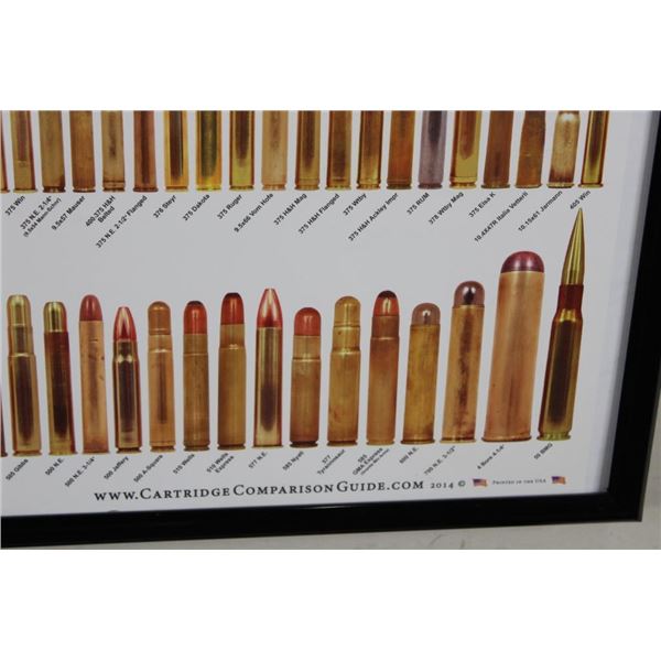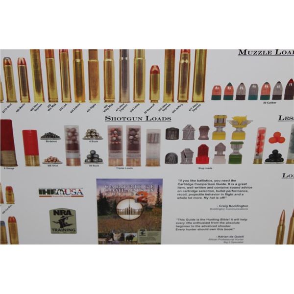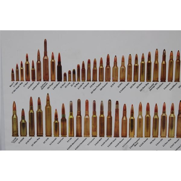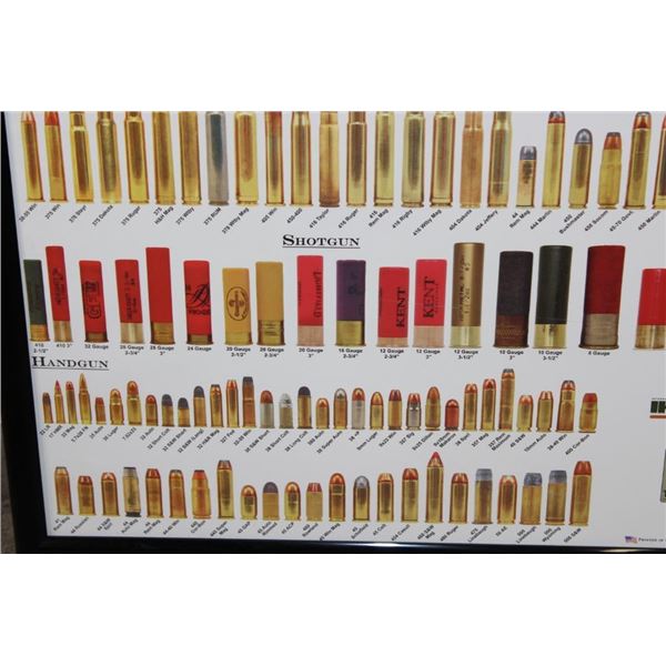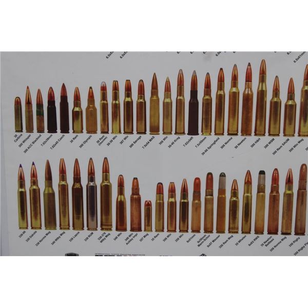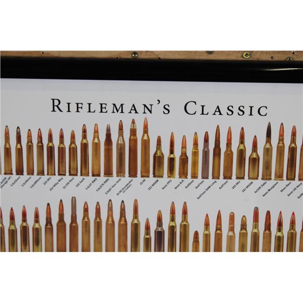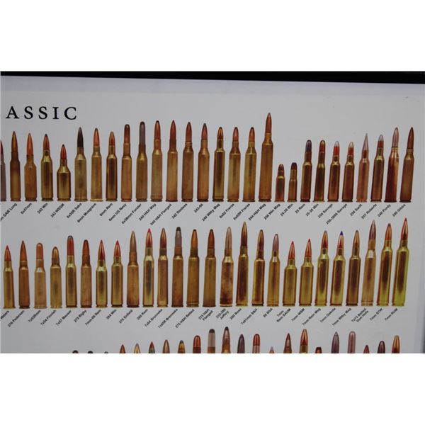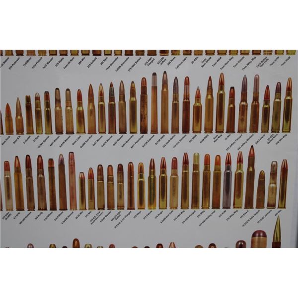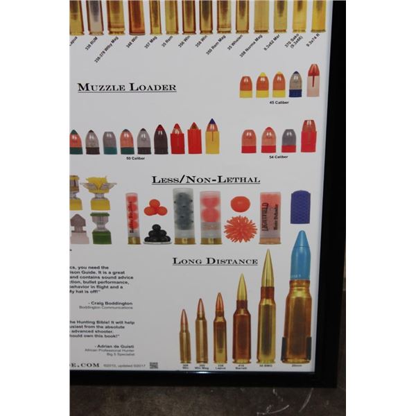 1 "Rifleman's Classic" Bullet Caliber Guide in a 41" Long x 28" Wide plastic poster frame with labels. 1 "American Standard" Bullet Chart with Labels in a 37" Long x 25" Wide plastic poster frame. (ONE$) COLLECTIBLE HUNTING ART