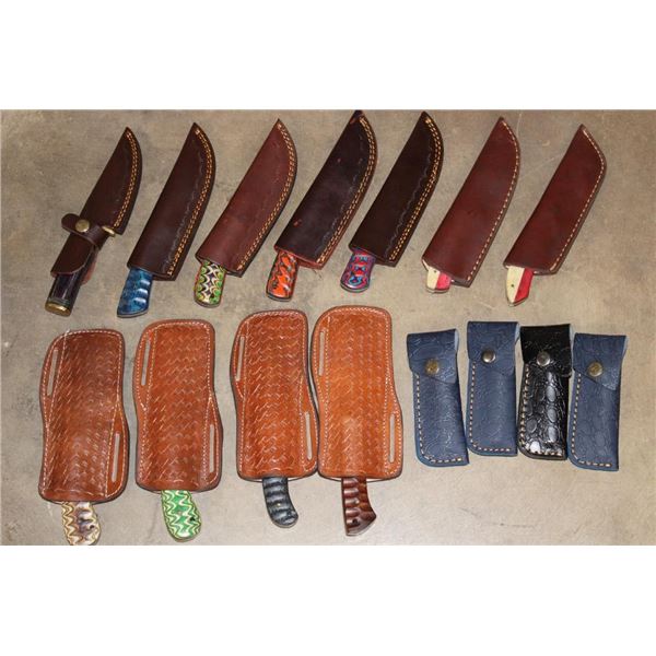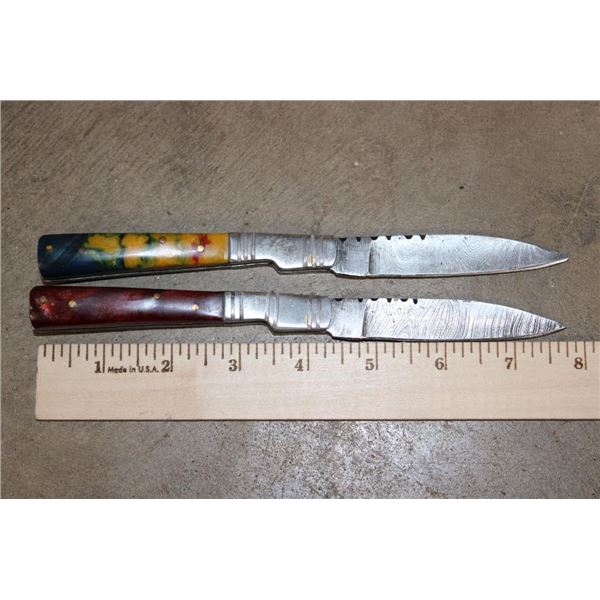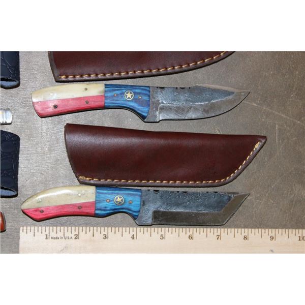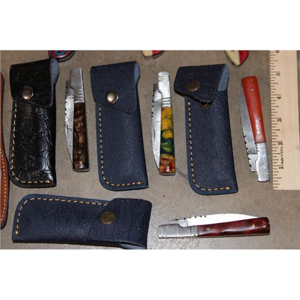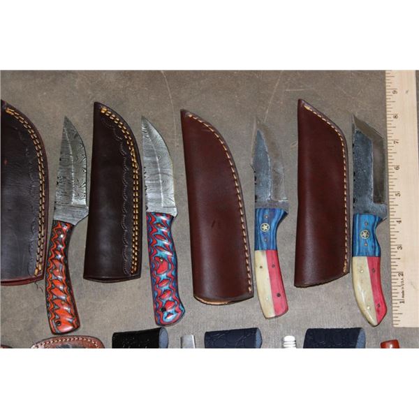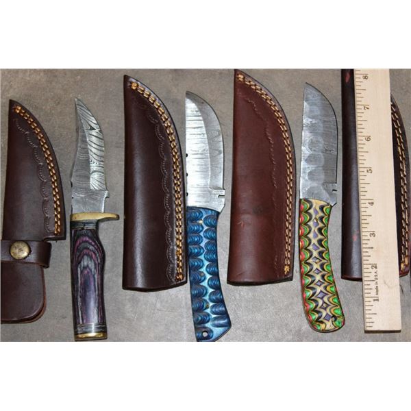 15 *New* Damascus Knives with Leather Sheaths. There are 5 Damascus Fixed Blade Knives, 4 Damascus Steel Pocket Knives, and 6 Carbon Steel Fixed Blade Knives. Each has its own brightly colored wood or resin handle. (ONE$) FIXED BLADE AND POCKET KNIVES