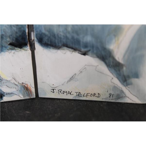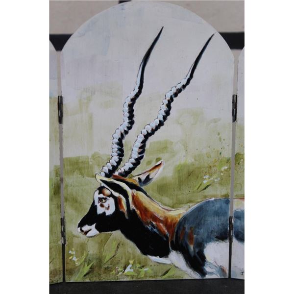 Beautiful BLACKBUCK that is hand painted on a hinged wooden panel resembling a window. Opens and closes. It is signed "J.Royal Telford, 1991". Measures 7" Tall x 8.5" Wide when opened. Jim Telford (1932-2003) was a Texas born artist known for his watercolors of costal objects and hill country painted country scenes. COLLECTIBLE ART PAINTINGS FOLK ART