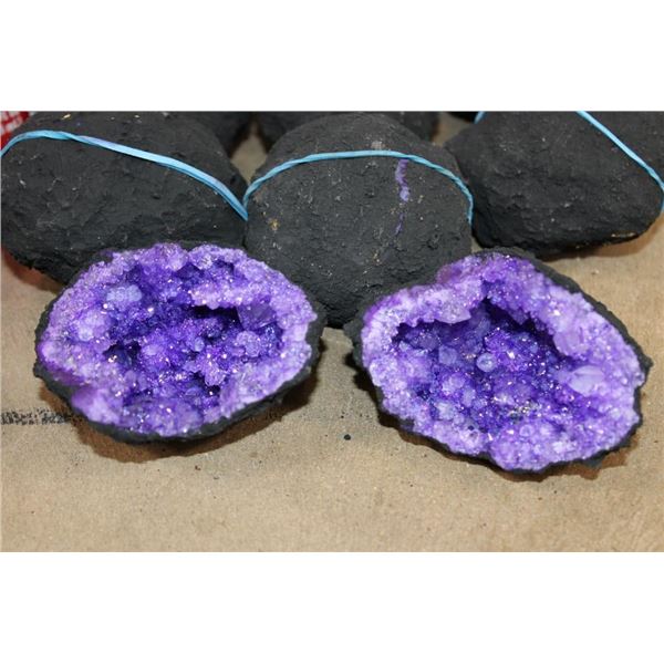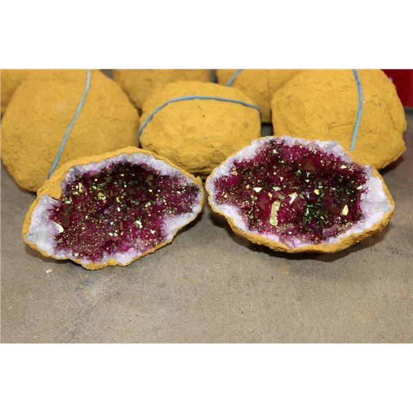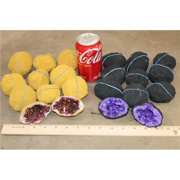 20 Crystal Quartz Geodes. There are 10 Dyed Purple Crystal Quartz Geodes and 10 Titanium Aura Green Geodes. The Total Weight is 7 lbs 15 oz. The core of the aura quartz is natural clear quartz crystal that has been heat treated in a lab and iridescent coated with metal to achieve the affect. (ONE$) ROCKS FOSSILS MINERALS CRYSTALS