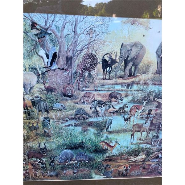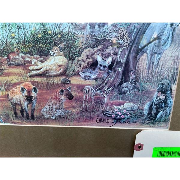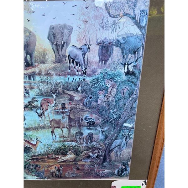 Beautiful Art Print of Africa's Animals. It is entitled "All Creatures" and is signed by the artist "Charlotte FK 1992". The Glass and Wood Frame measures 35" Long x 27" Wide. To Learn more about the artist click the link below: