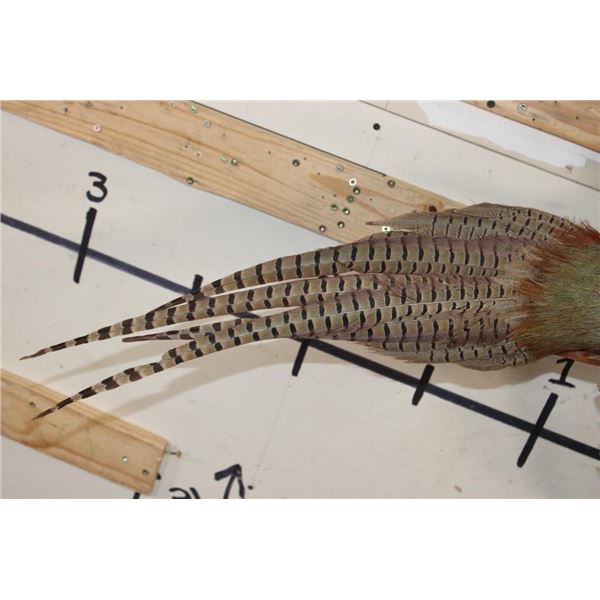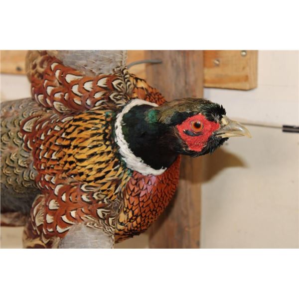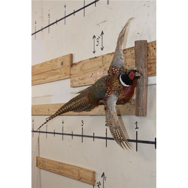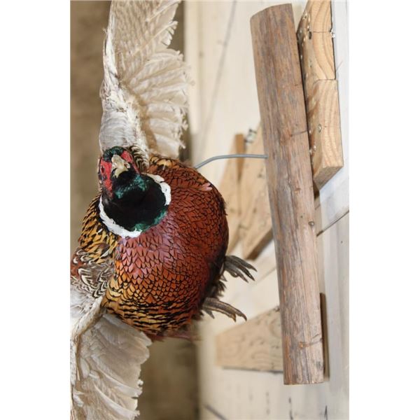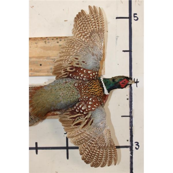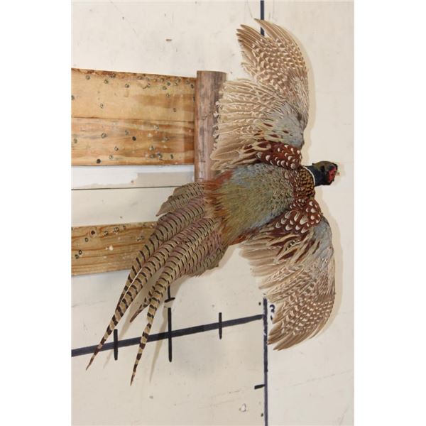 Very Nice Life-sized Flying RING NECK PHEASANT on a Wooden Wall Hanger. It is in Very Good Condition. TAXIDERMY