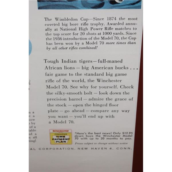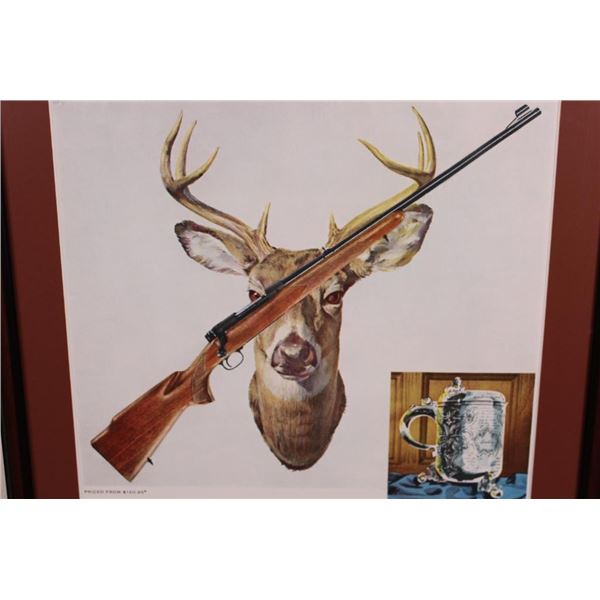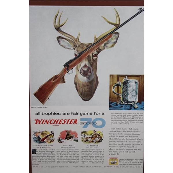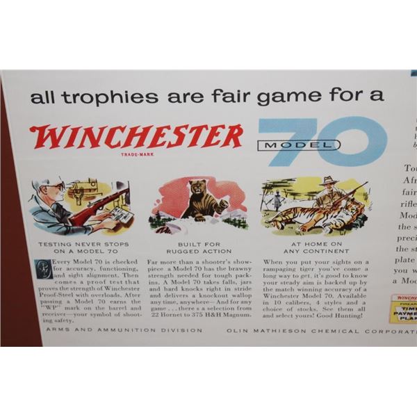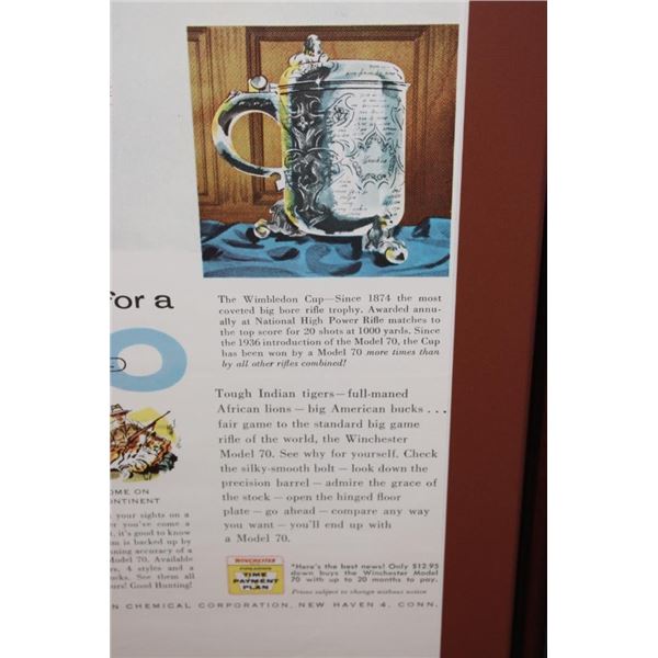 Reproduction (The image has been enlarged) framed Winchester Model 70 Rifle Advertisement from True Magazine 1965. It is in a nice 40.75" Long x 28.75" Wide wood and glass frame. COLLECTIBLE HUNTING ADVERTISEMENT
