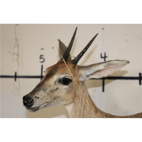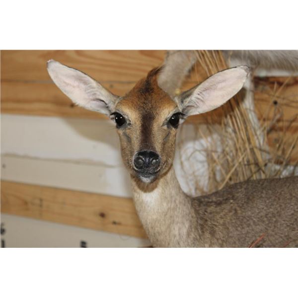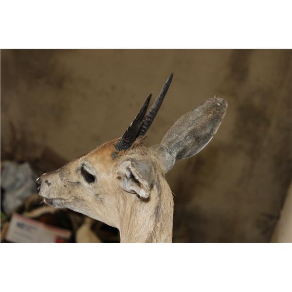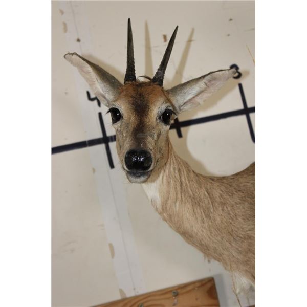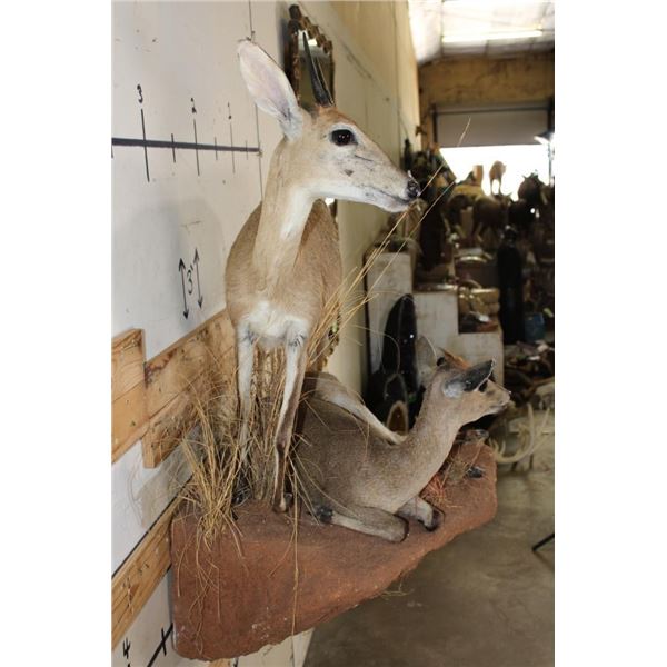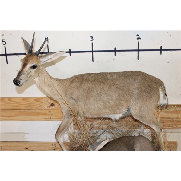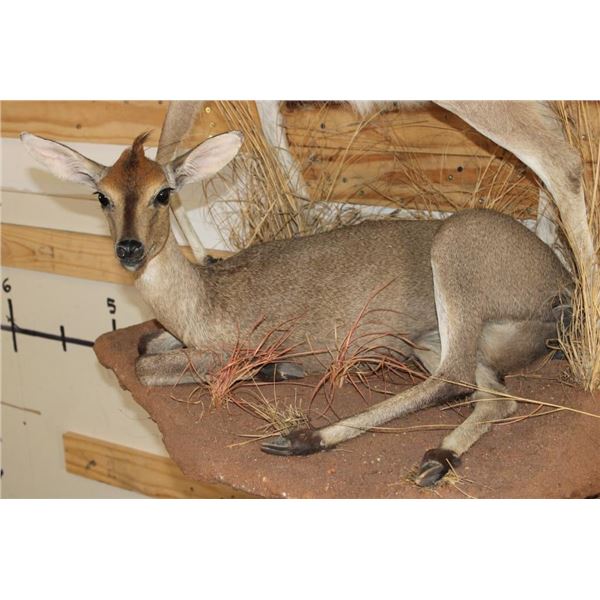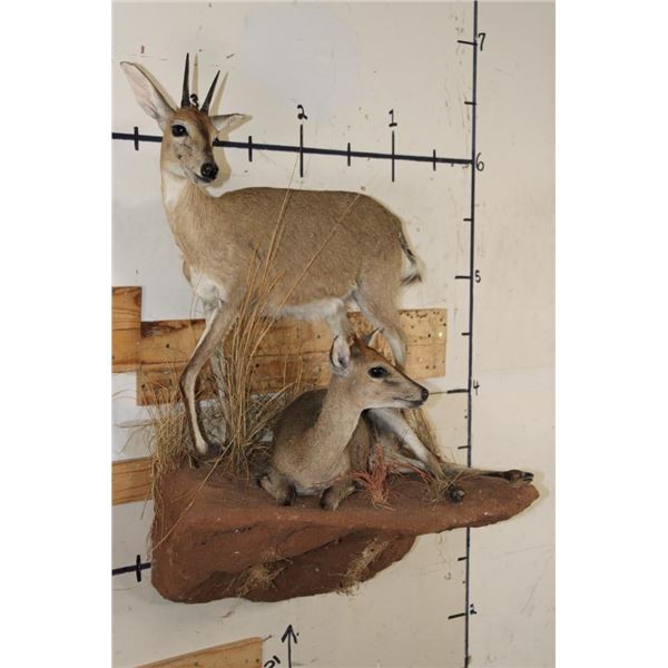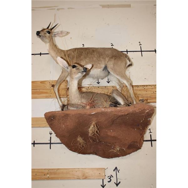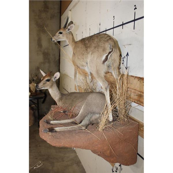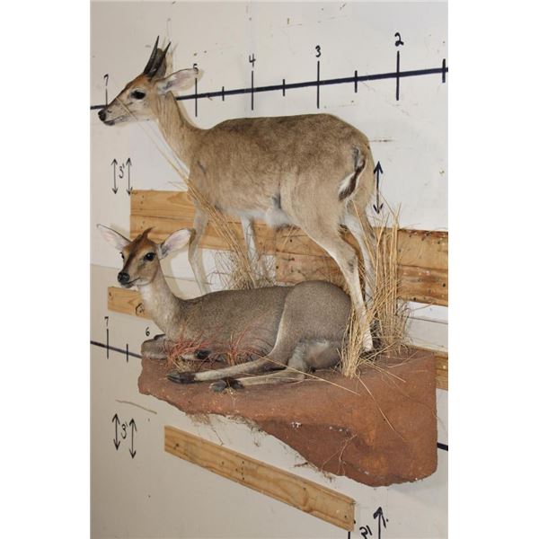 2 Life-sized COMMON DUIKERS on a simulated Rock Wall Hanging Base. It measures 3' Long x 4' Tall x 2' Depth (from wall). It has minor hide rubs and minor ear damage but is otherwise a nice mount. TAXIDERMY