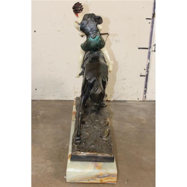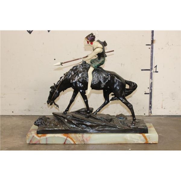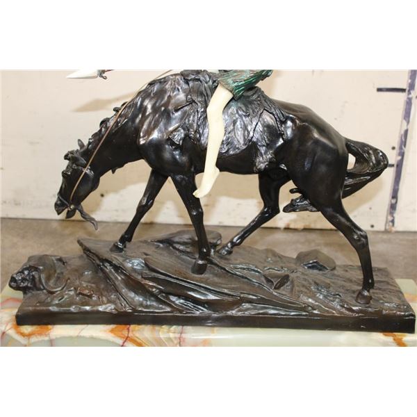 XL "Le Cavalier Indien" or "Native American on Horse" BRONZE Sculpture after Edouard Drouot on an ONYX Base. It is signed "Edouard Drouot" (French Sculptor 1859-1945) and measures 26" Long x 6.5" Wide x 21.75" Tall. The right hand is missing 2 fingers. The Total Weight is 63 lbs 1 oz. COLLECTIBLE BRONZE SCULPTURES