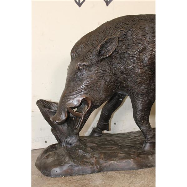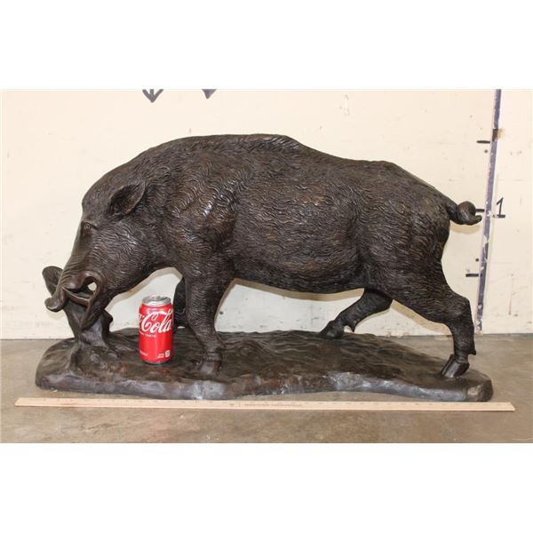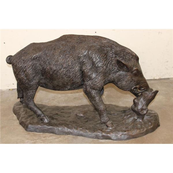 XL Boar Bronze Sculpture after Pierre-Jules Mene (1810-1879). It measures 3' Long x 13" Wide x 19.5" Tall and Weighs 54 lbs 20 oz. The large wild boar has its head bowed as if to charge a sportsman or other foe. Its backside is masterfully embellished with an array of detailed bristled hair. This closely resembles a Razorback. Perfect for any Arkansas fan! COLLECTIBLE BRONZE ART SCULPTURES AND STATUES