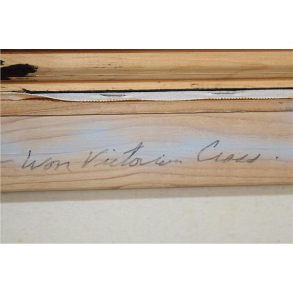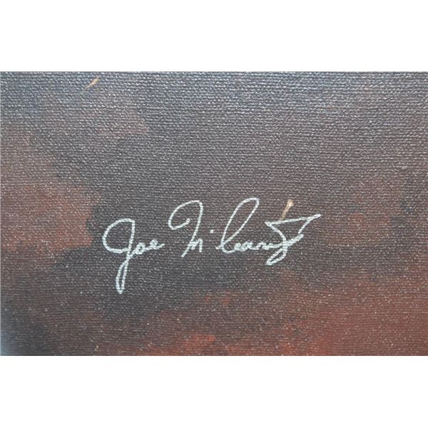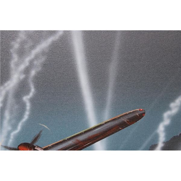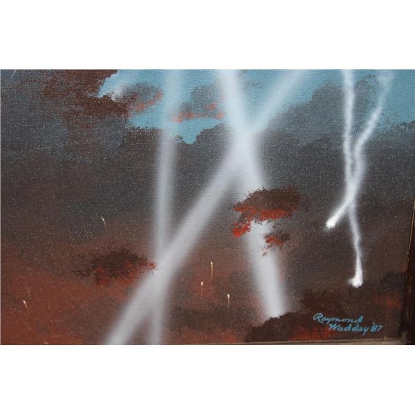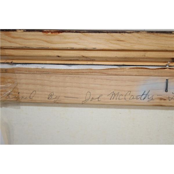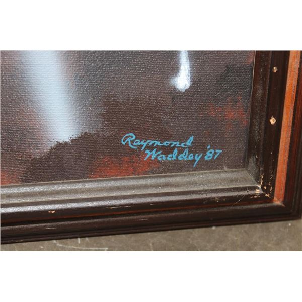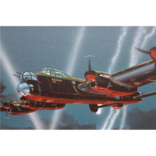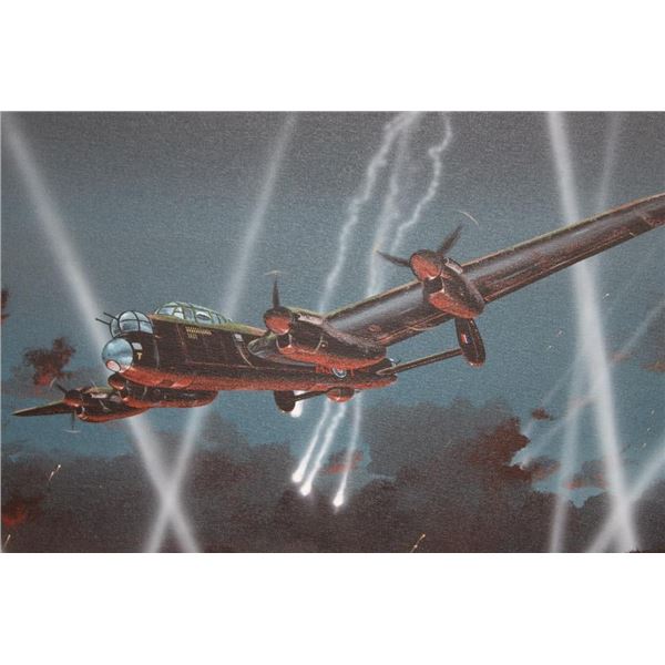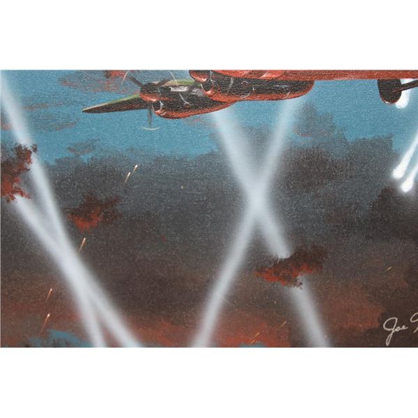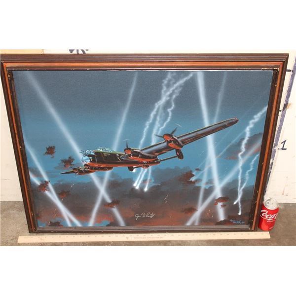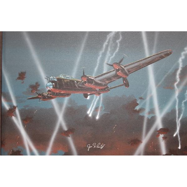 Original signed and dated Raymond Waddey 87' Oil Painting also Signed by Joe McCarthy. Handwritten in pencil on the back of the frame "Signed by - Joe McCarthy -Lancaster Bomber Pilot who won the Victorian Cross". The Wooden Frame measures 33" Long x 27" Wide. COLLECTIBLE AVIATION AND MILITARY ART PAINTINGS