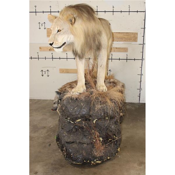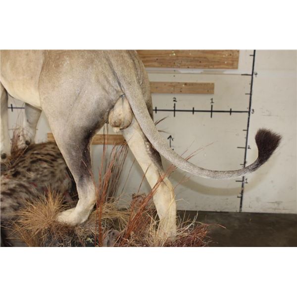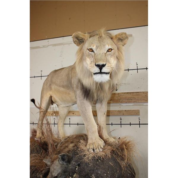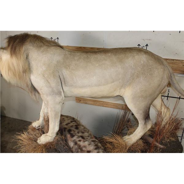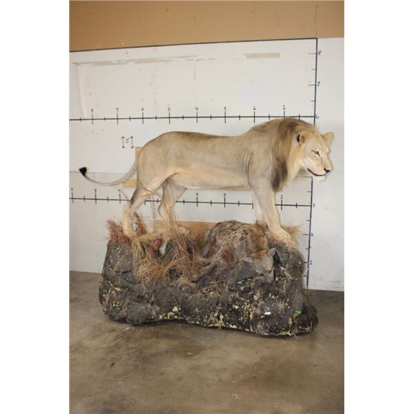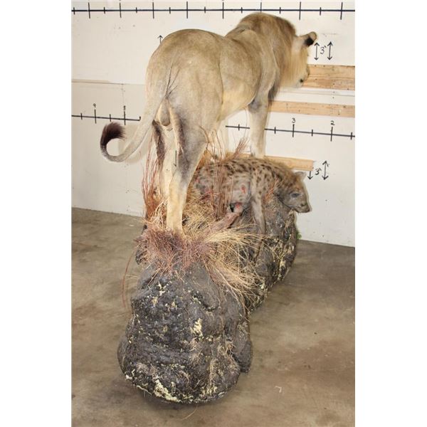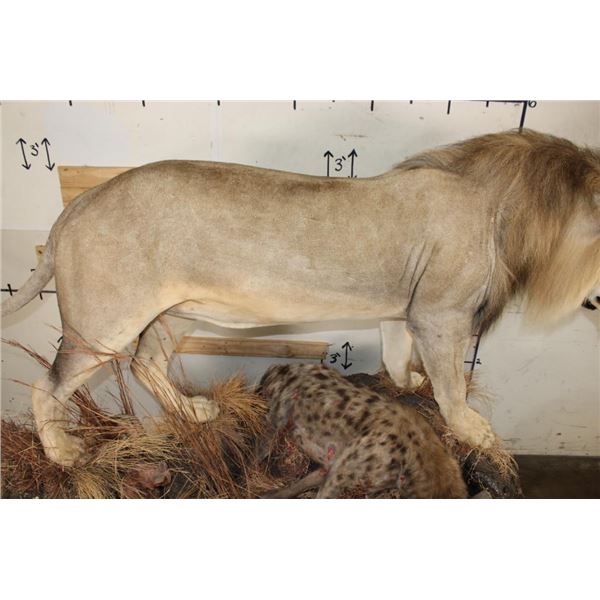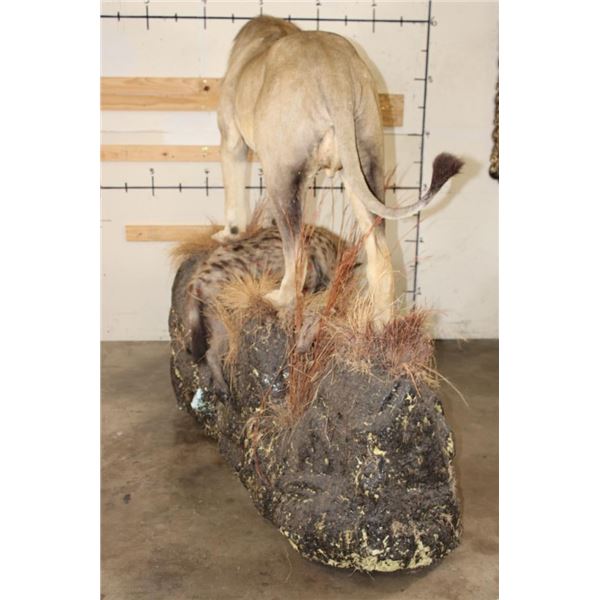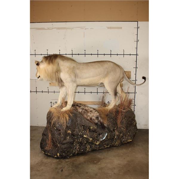 *TEXAS RESIDENTS ONLY!!!* Life-sized AFRICAN LION standing over his HYENA Kill on a Rock Base with Wheels. The Lion measures 7'6" Long from the Nose to the Tail. No Claws. The Total Mount measures 3' Wide x 5'11" Tall. The Base could use some paint but the mount is in Very Good Condition. TAXIDERMY