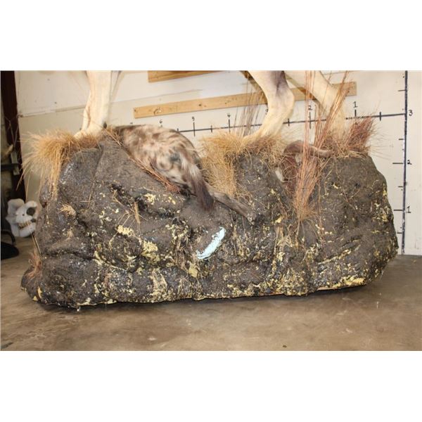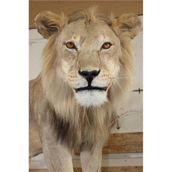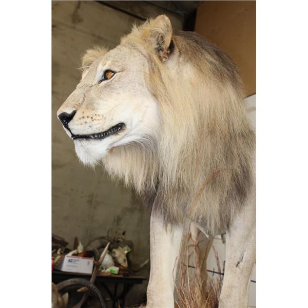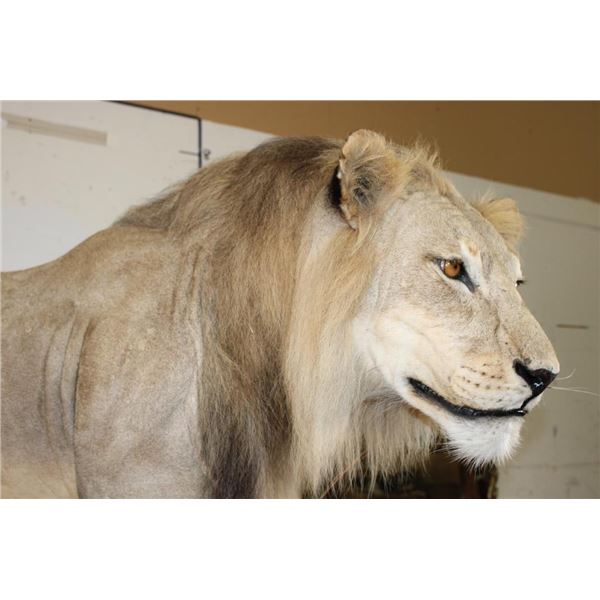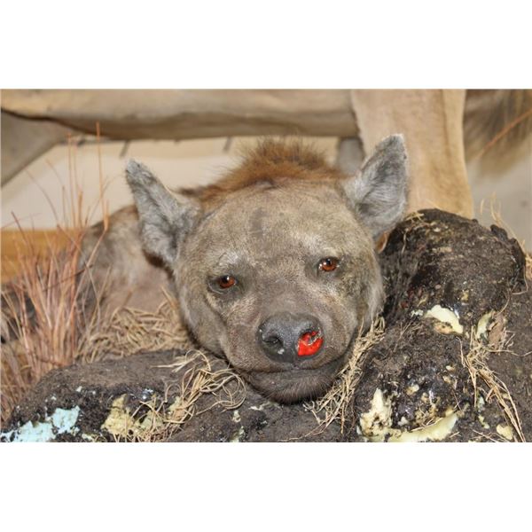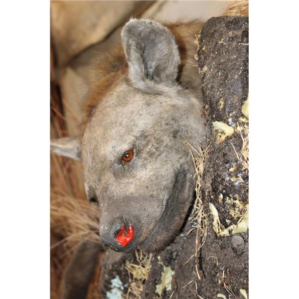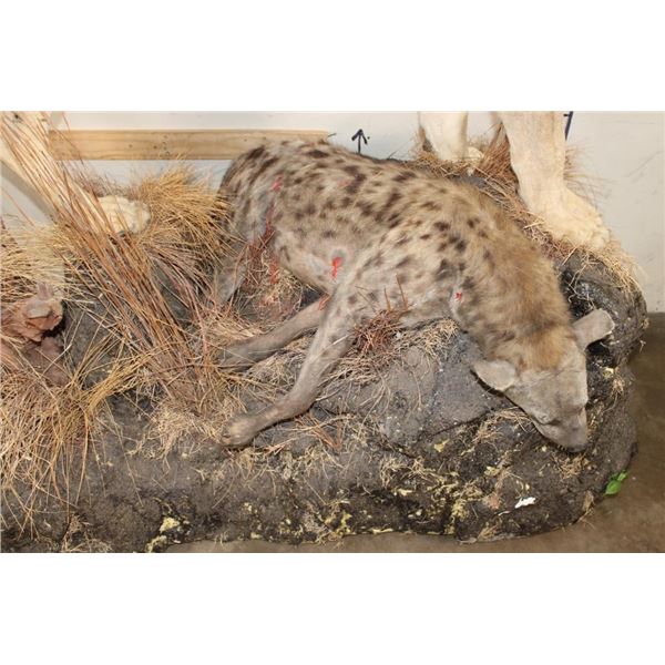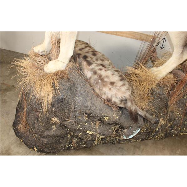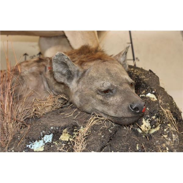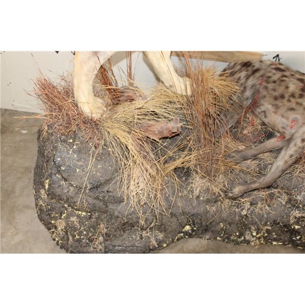 *TEXAS RESIDENTS ONLY!!!* Life-sized AFRICAN LION standing over his HYENA Kill on a Rock Base with Wheels. The Lion measures 7'6" Long from the Nose to the Tail. No Claws. The Total Mount measures 3' Wide x 5'11" Tall. The Base could use some paint but the mount is in Very Good Condition. TAXIDERMY