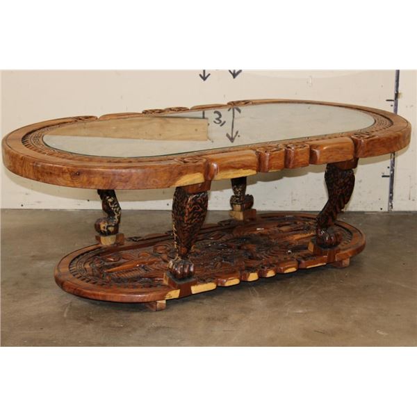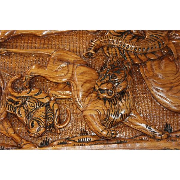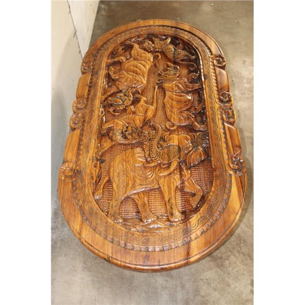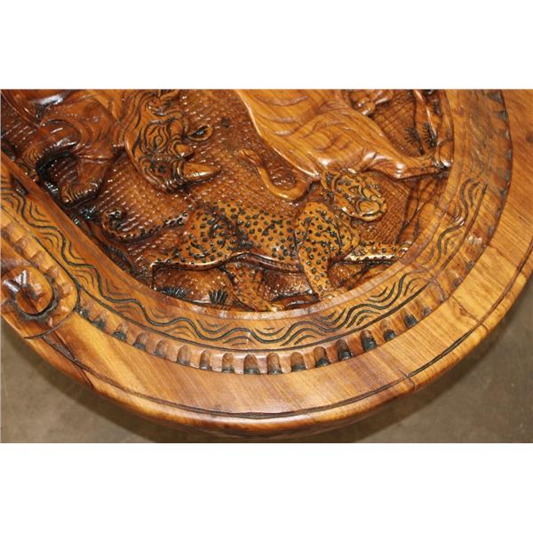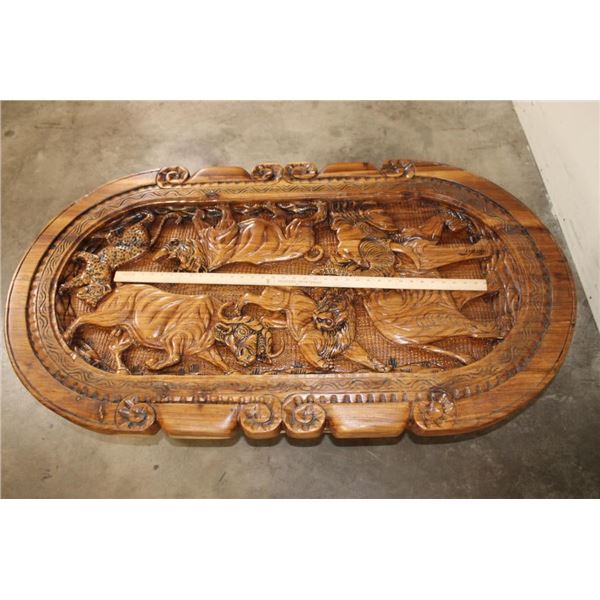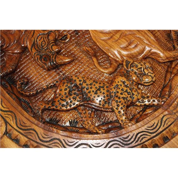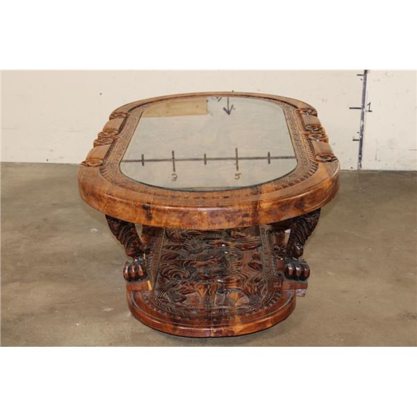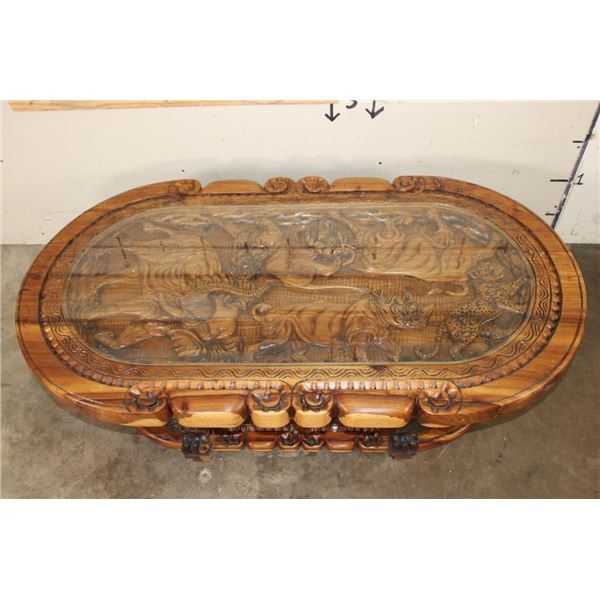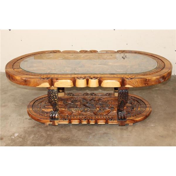 Beautiful Hand-crafted and Hand-carved African "Big 5" Coffee Table. The level of detail is extraordinary. There are two tiers with the "Big 5", an Elephant, Lion, Rhino, Cape Buffalo, and a Leopard are expertly carved. It measures 55.5" Long x 29.5" Wide x 19" Tall and features removable glass. DECORATIVE ART FURNITURE