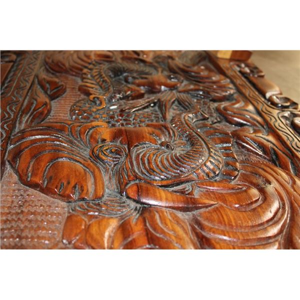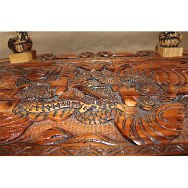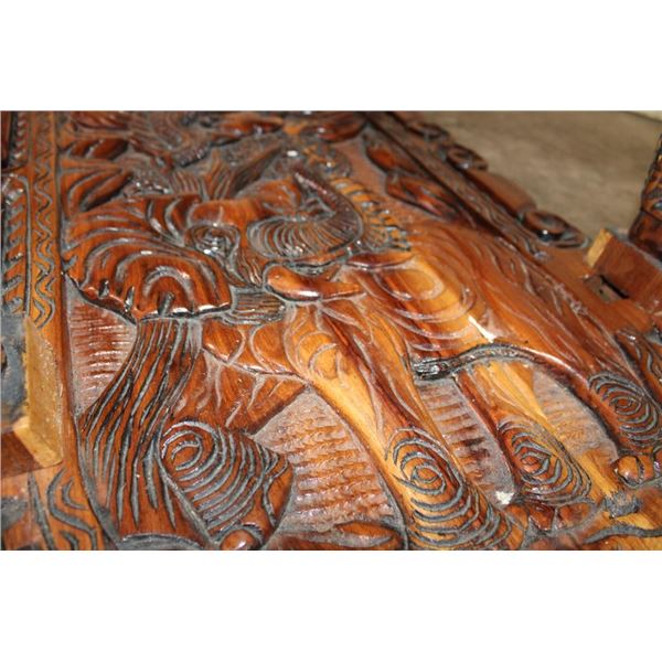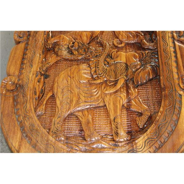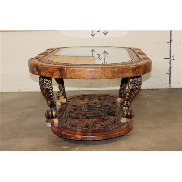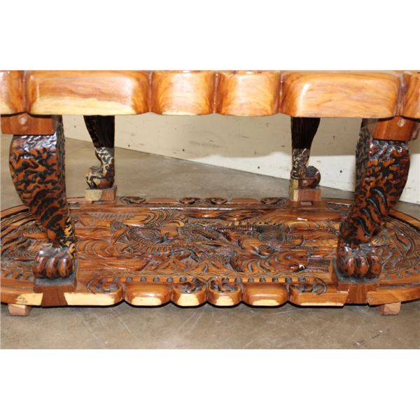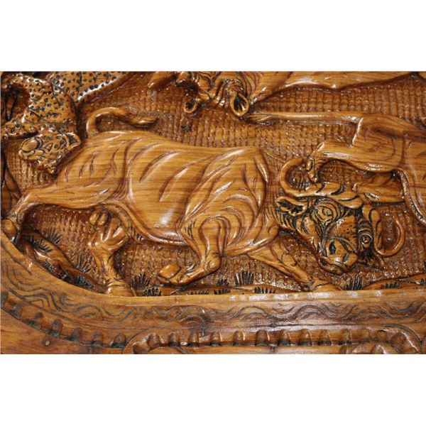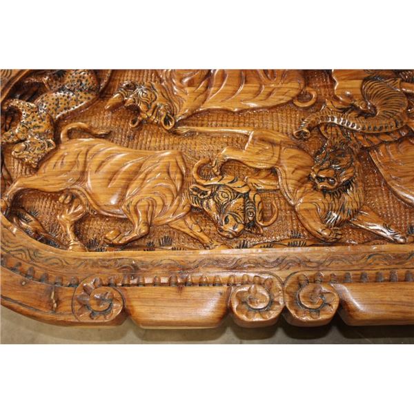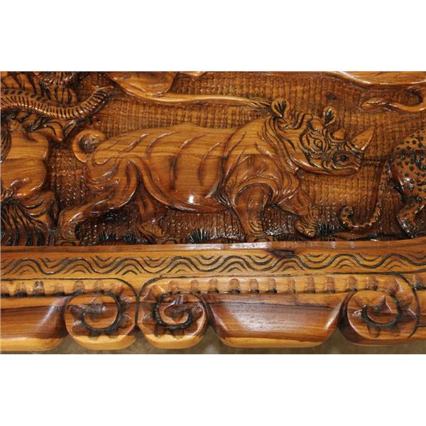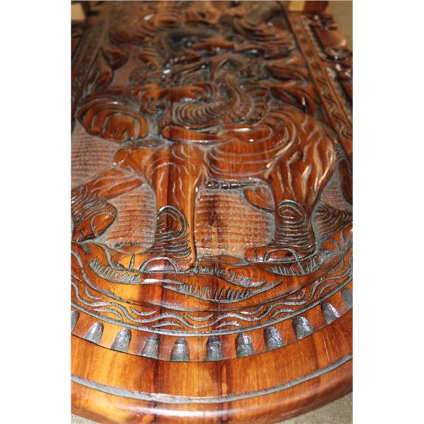 Beautiful Hand-crafted and Hand-carved African "Big 5" Coffee Table. The level of detail is extraordinary. There are two tiers with the "Big 5", an Elephant, Lion, Rhino, Cape Buffalo, and a Leopard are expertly carved. It measures 55.5" Long x 29.5" Wide x 19" Tall and features removable glass. DECORATIVE ART FURNITURE