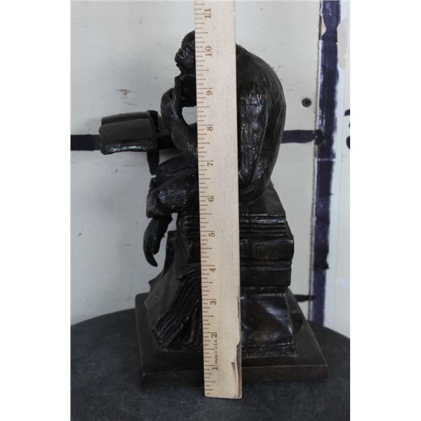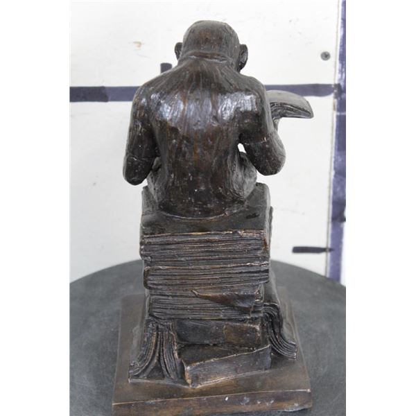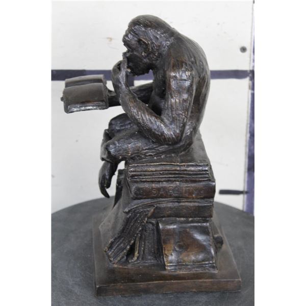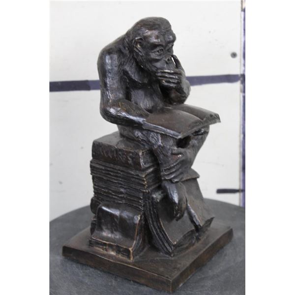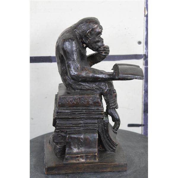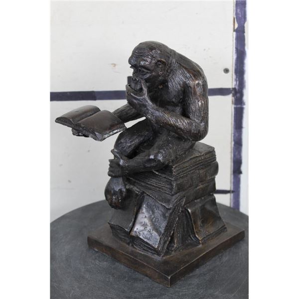 BRONZE CHIMPANZEE sitting on a stack of books. He is reading and contemplating his thoughts. A homage to "The Thinker" Statue. Measures 10.5" Tall x 5.5" Wide x 5.5" Depth and a Total Weight of 7lbs 13oz. COLLECTIBLE ART BRONZE SCULPTURES