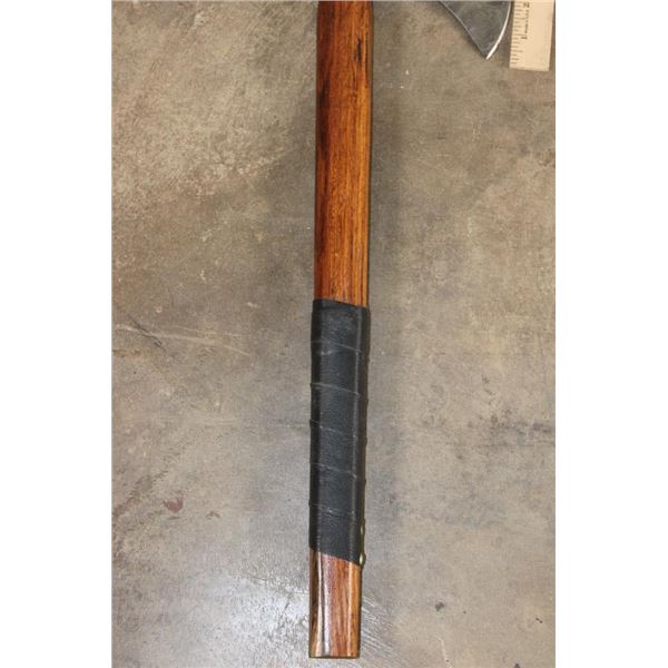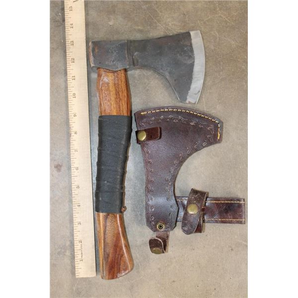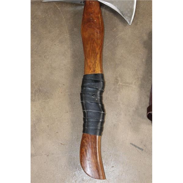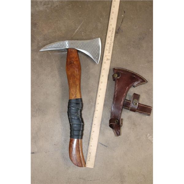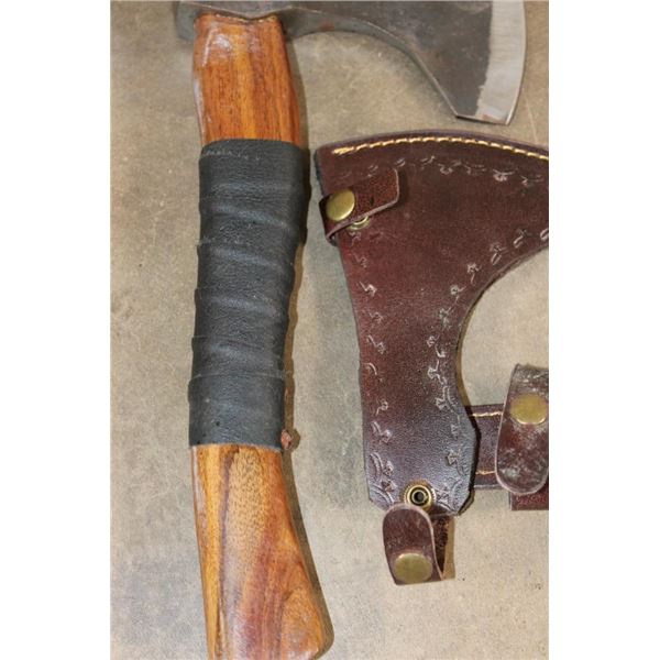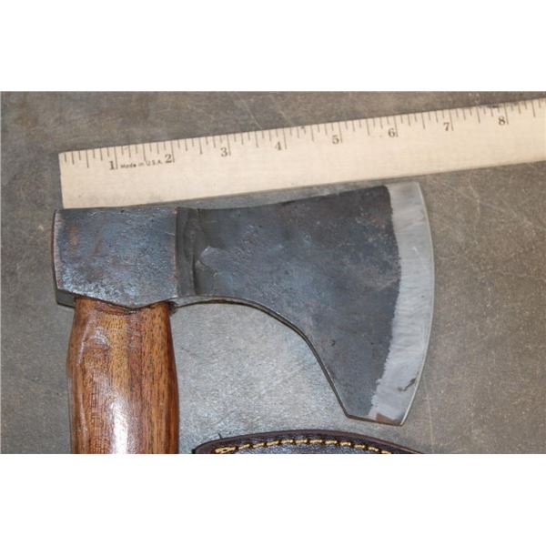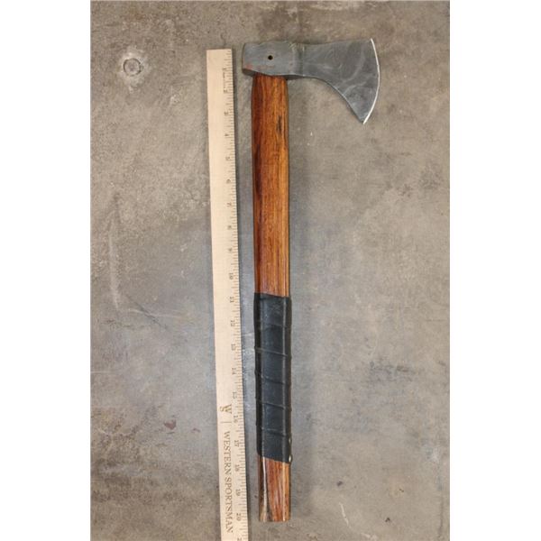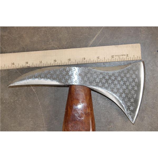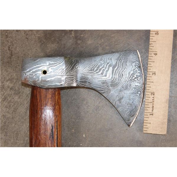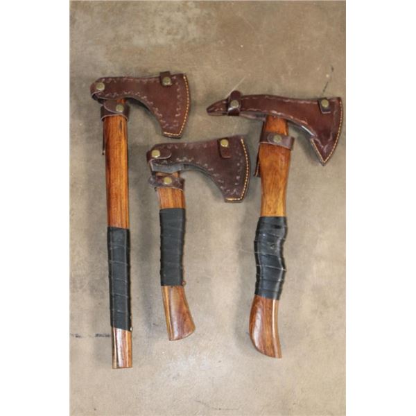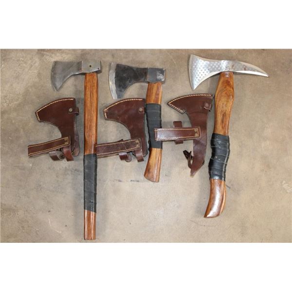 1 Damascus Steel Hatchet with a wooden handle that measures 18.75" Long and the Total Length is 20" Long. 1 Smaller Steel Hatchet with a wooden handle that measures 11.25" Long and the Total Length is 12.75" Long. 1 Steel Pick Axe with a Star design on the head or blade with a wooden handle. It measures 16.5" Long and the Total Length is 17.75" Long. These would make fun throwing axes! (ONE$) AXES AND MACHETES