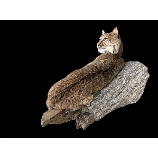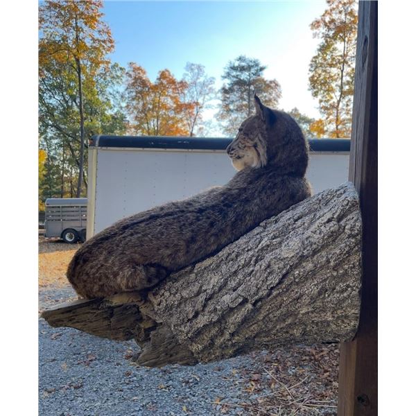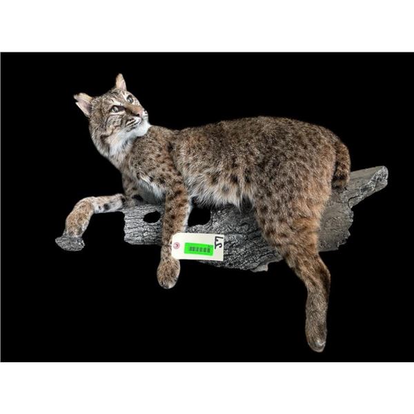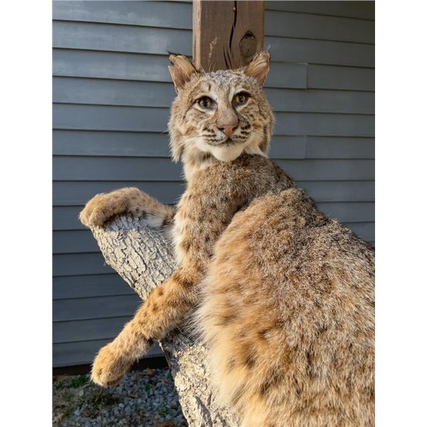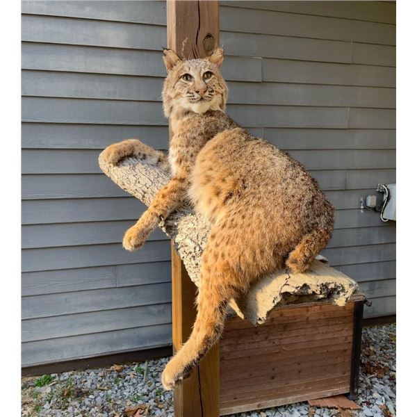 Beautiful *New* Life-sized Spotted BOBCAT. He is lounging on a tree limb and measures 27" Tall x 28" Long x 22" Depth (from the wall). TAXIDERMY