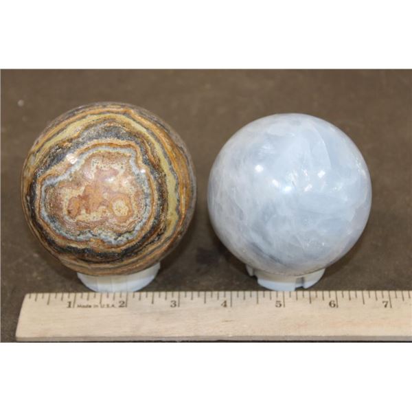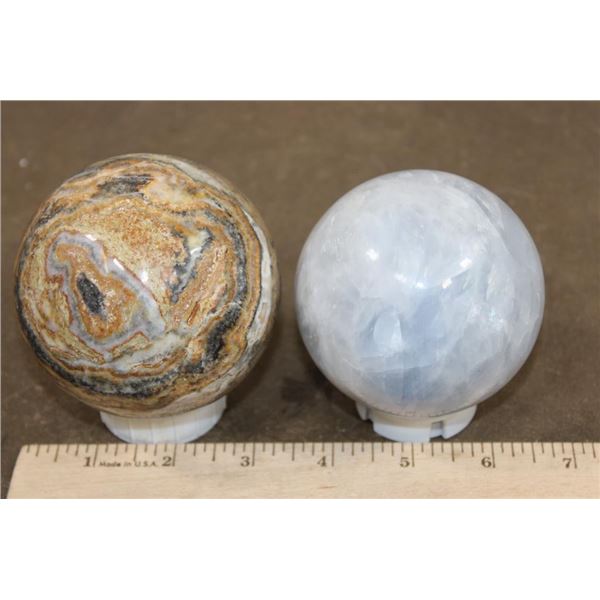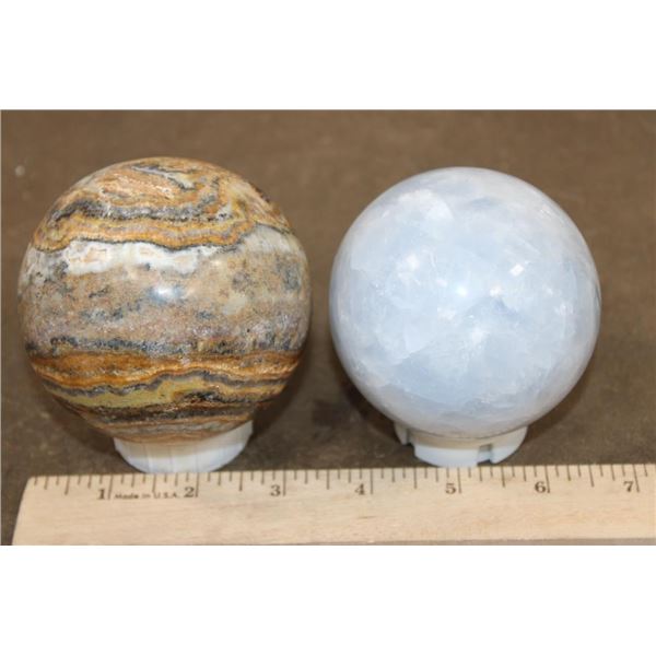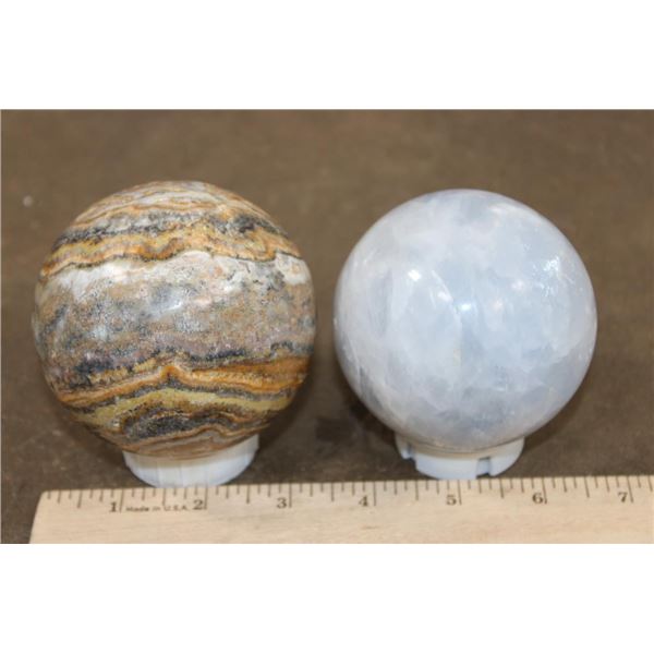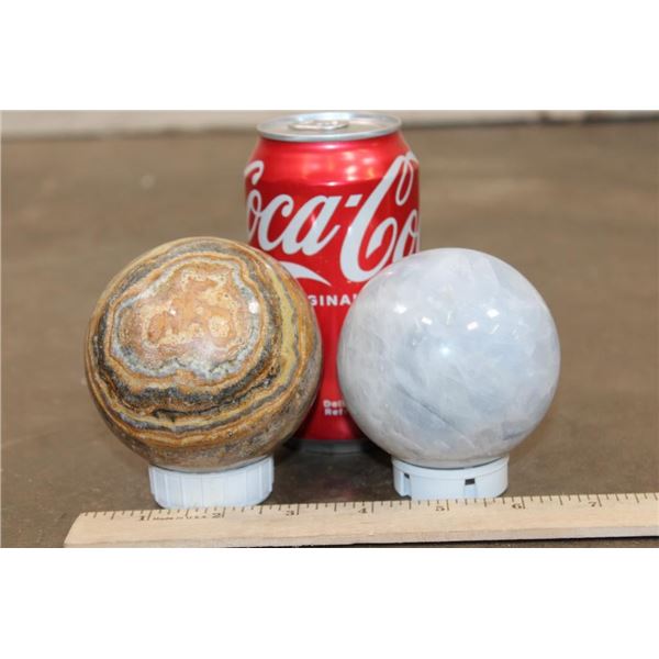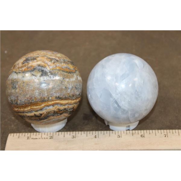 2 Mineral Spheres. Pictured left is a Banded CHALCEDONY that measures 3 3/8" in Diameter and Weighs 1 lb 14 oz. Pictured right is a BLUE CELESTITE Mineral Sphere that measures 3.25" in Diameter and Weighs 1 lb 8 oz. Banded Chalcedony stones are known for their soothing, stabilizing, and communication enhancing properties. Blue Celestite is believed to promote relaxation, peace, and higher consciousness, making it popular for meditation and prayer. (ONE$) ROCKS MINERALS FOSSILS SPHERES