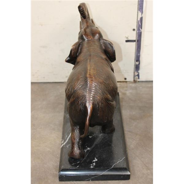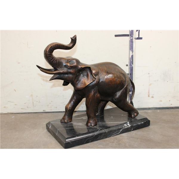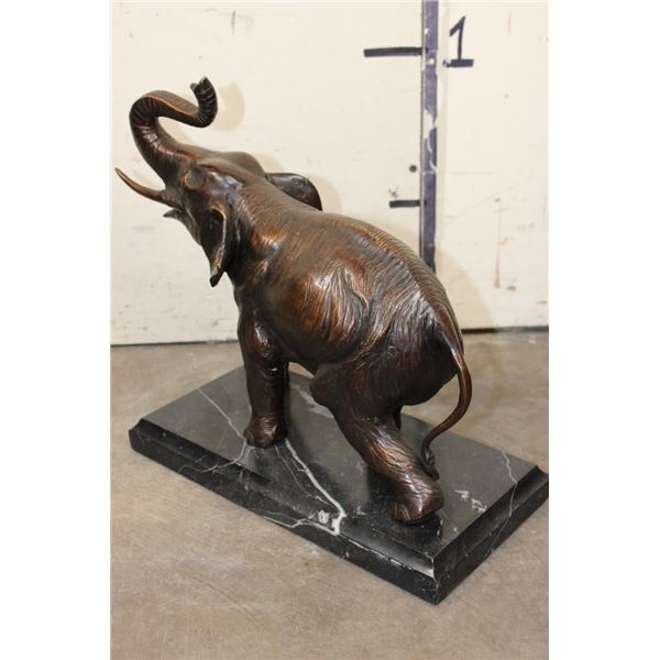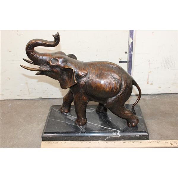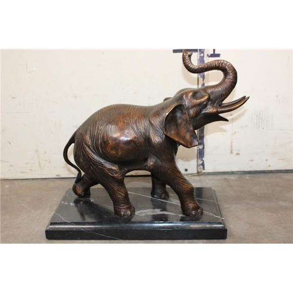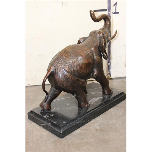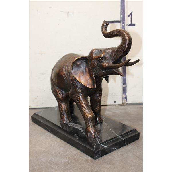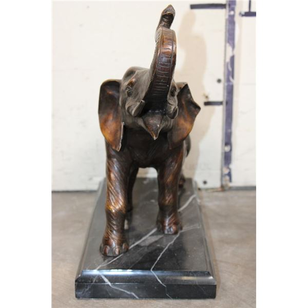 Lucky ELEPHANT BRONZE Sculpture on a Marble Base. The Total Weight is 16 lbs 13 oz and it measures 13.5" Tall x 13" Long x 6.5" Wide. In various cultural and symbolic contexts, an elephant with its trunk raised, especially in depictions like sculptures and statues, is associated with good fortune, prosperity, and wisdom. COLLECTIVE ART BRONZE SCULPTURES