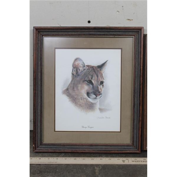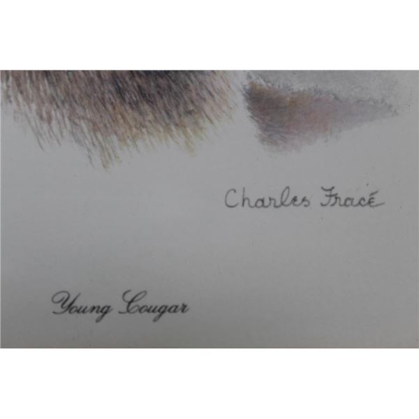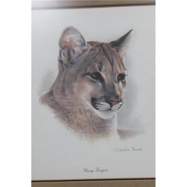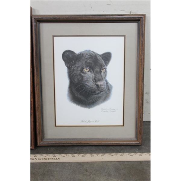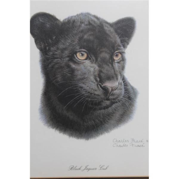 2 Framed Art Prints by Artist Charles Frace. The "Black Jaguar Cub" is signed in pencil and measures 14.5" Tall x 11.5" Wide. The other is entitled "Young Cougar" and measures 15" Long x 13" Wide. COLLECTIBLE ART