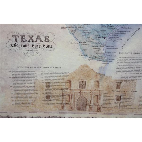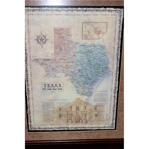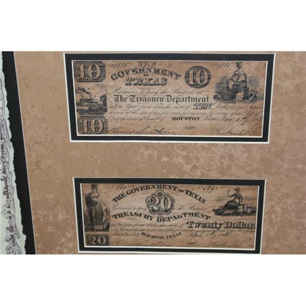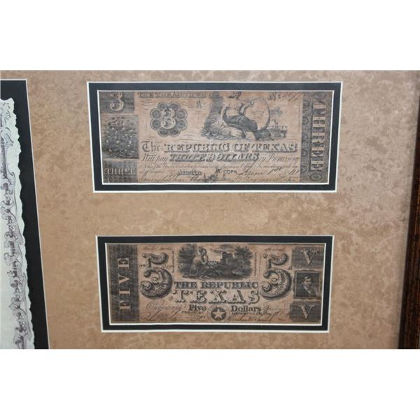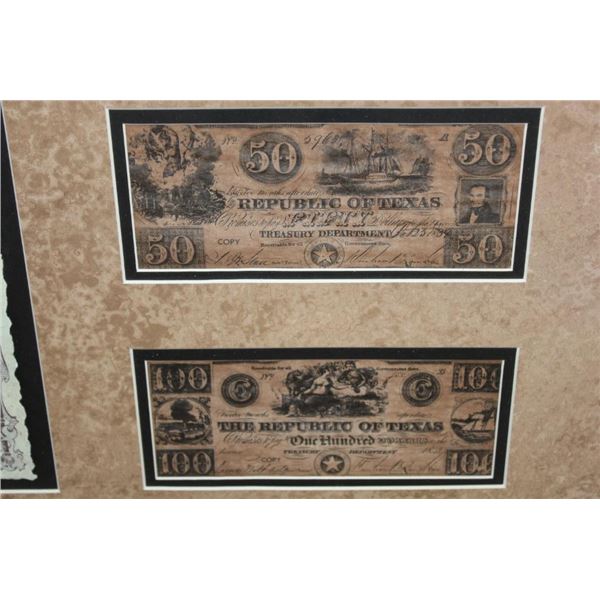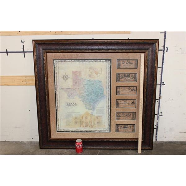 Large Framed Reproduction Republic of Texas Map with the Alamo and 6 Reproduction Currency Notes. The very nice wood and glass frame measures 42.5" Long x 40.5" Wide. HISTORICAL TEXAS MAPS