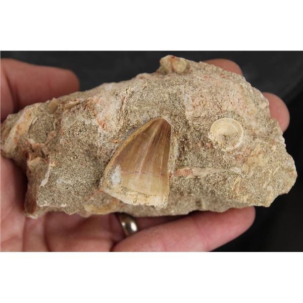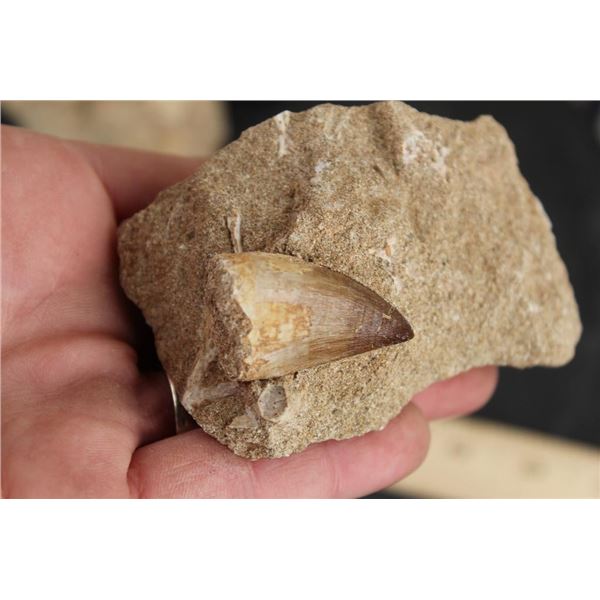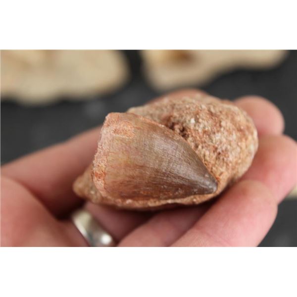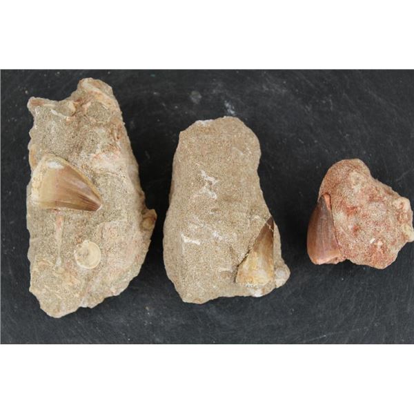 3 Prehistoric MOSASAUR TEETH in thier SANDSTONE Matrices. These Dinosaur Teeth are from the Cretaceous Age. They Weigh 1lb 2oz (ONE$). ROCKS MINERALS DINOSAUR FOSSILS