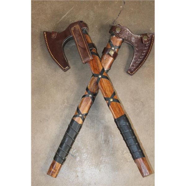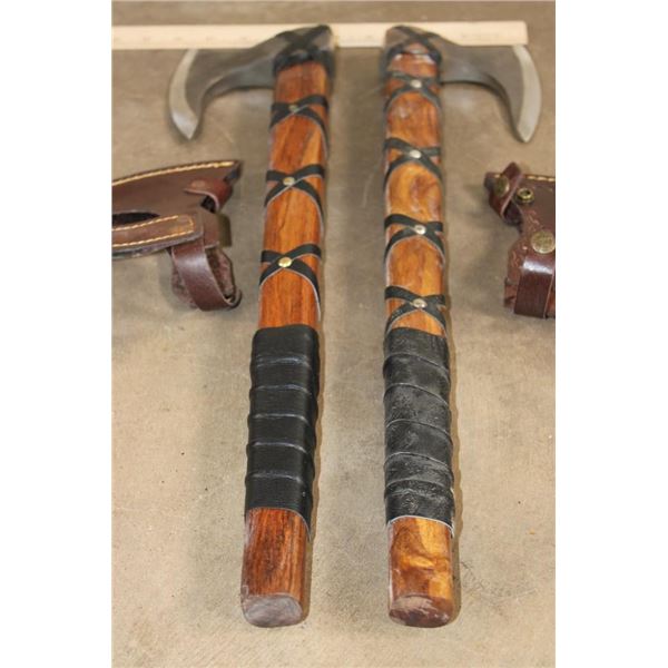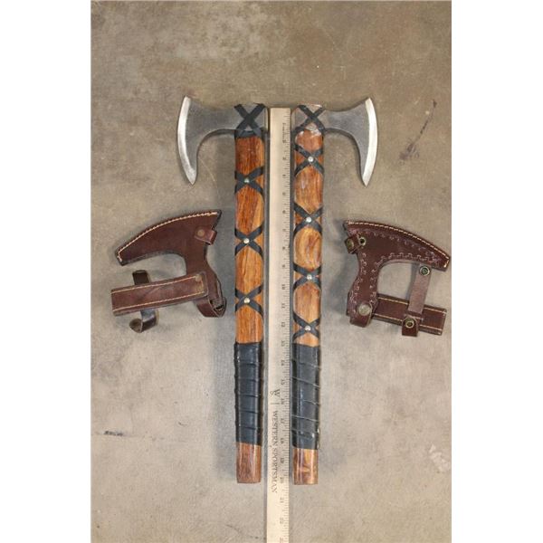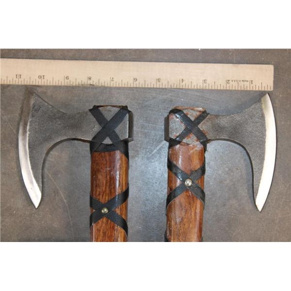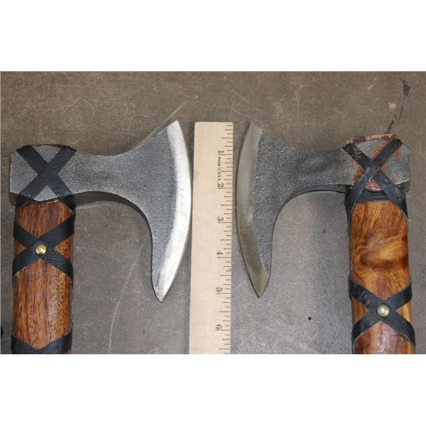 Contemporary Viking Battle AXE with Carbon Steel Blades. It has a wooden handle and measures 18.5" Long and the Total Length is 19.75" Long. This would be great for axe throwing or practical use! AXES AND MACHETES
