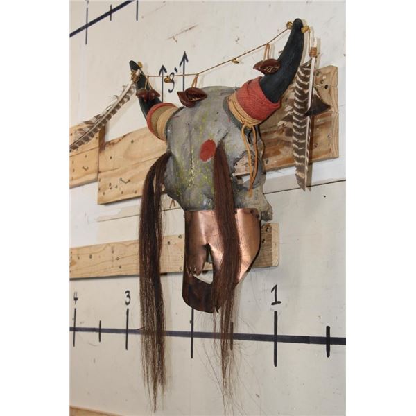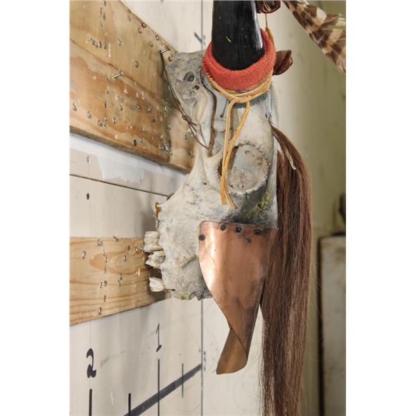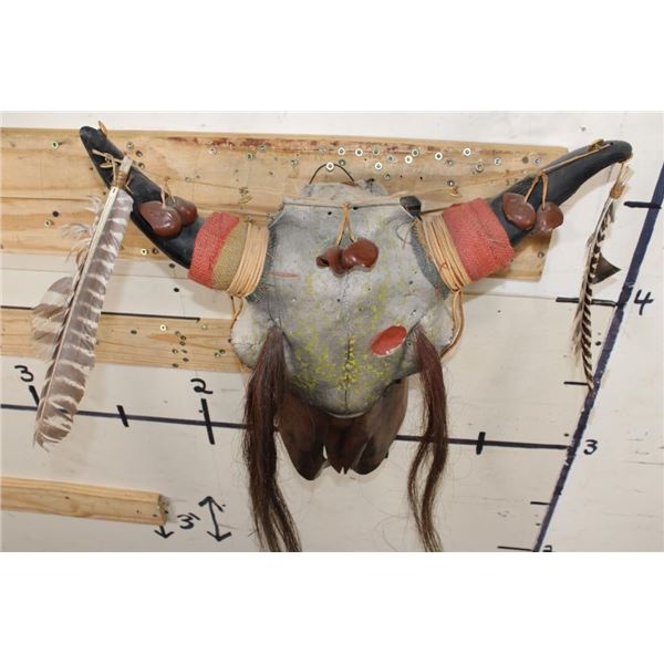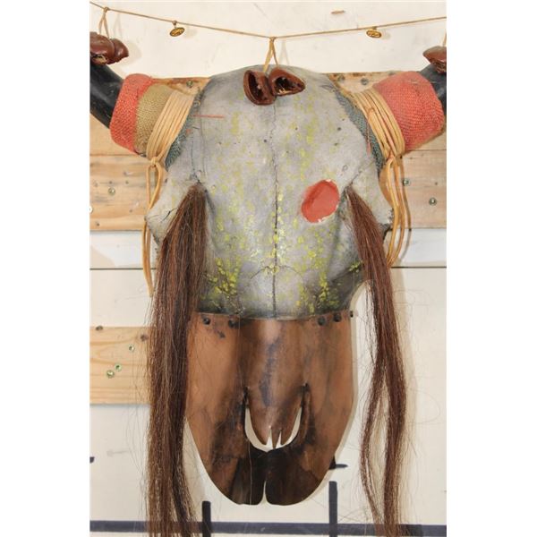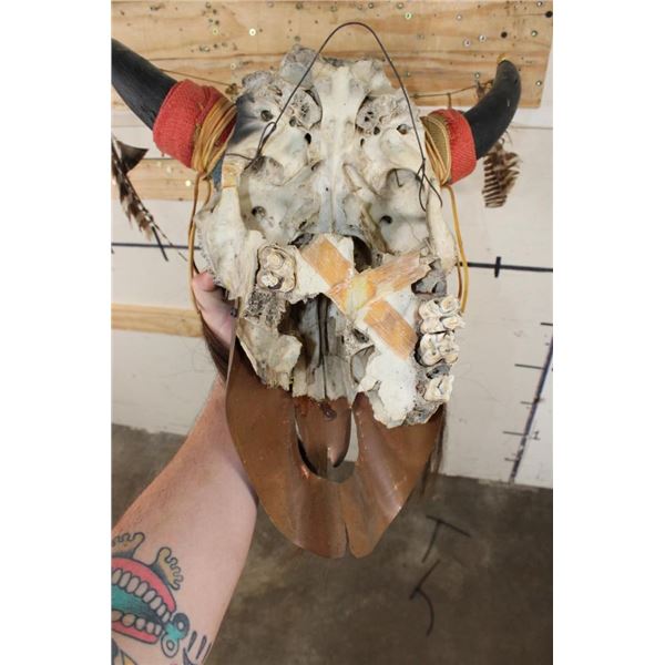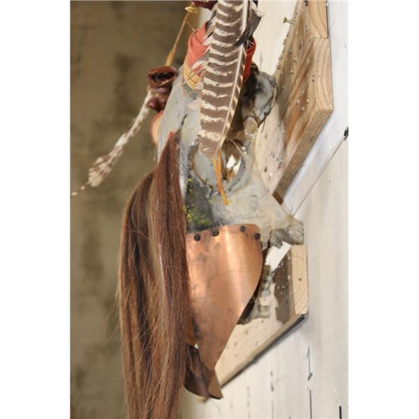 Partial BUFFALO/BISON Skull Decorated with Copper, Animal hair, feathers, Shells, and painted buttons. DECORATIVE TAXIDERMY