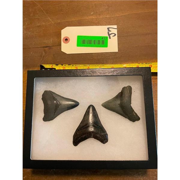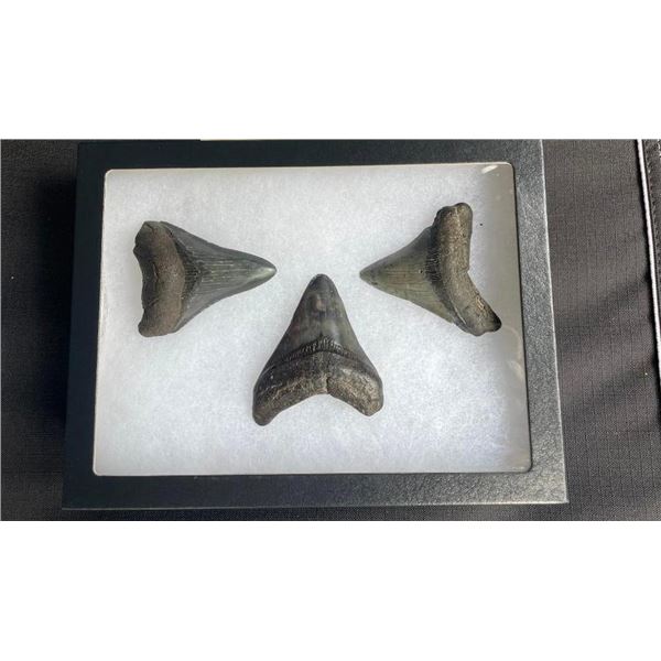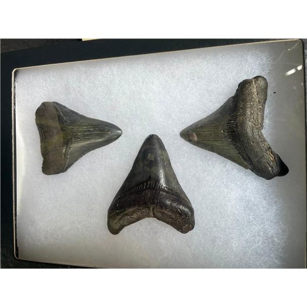 3 Excellent MEGALODON SHARK Tooth Fossils. They measure 2.25"-2.5" Long x 2.25" Wide each and the Glass Display Case is 6.25" Long x 5.25" Wide. Weighing as much as 30 large great white sharks, the Megalodon is one frightening fish! Luckily, they went extinct some 2.5 million years ago. SHARK TOOTH FOSSILS