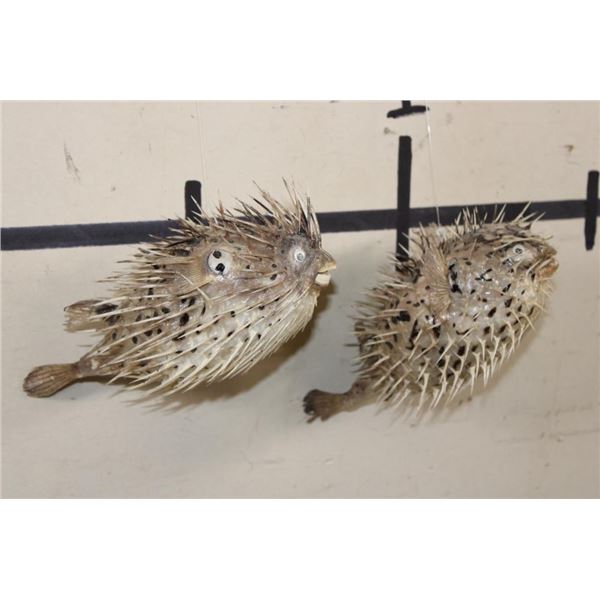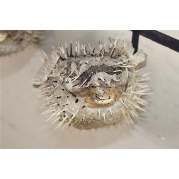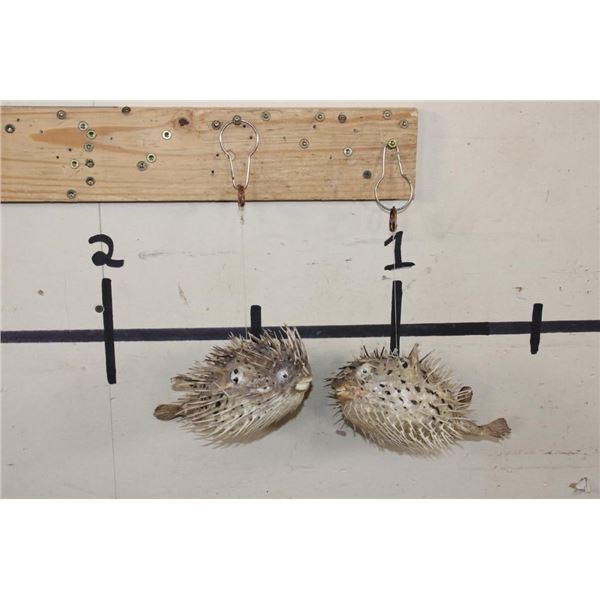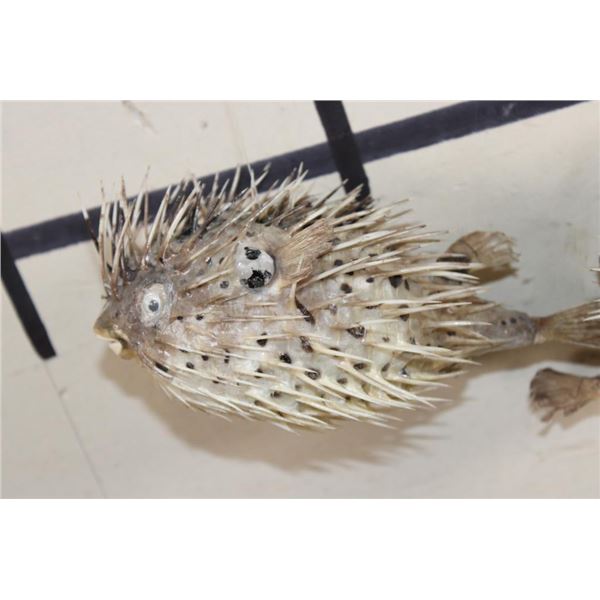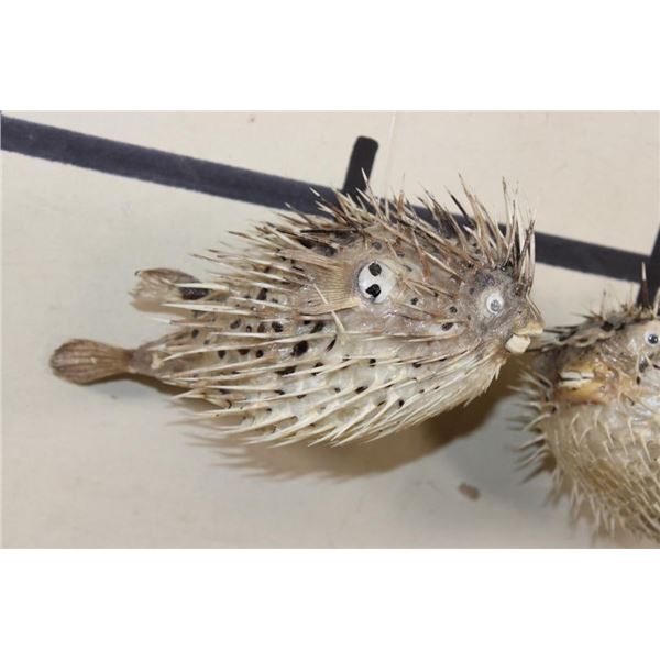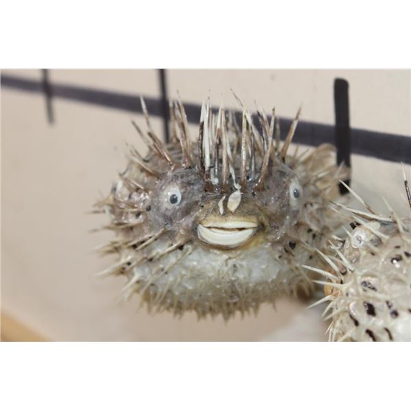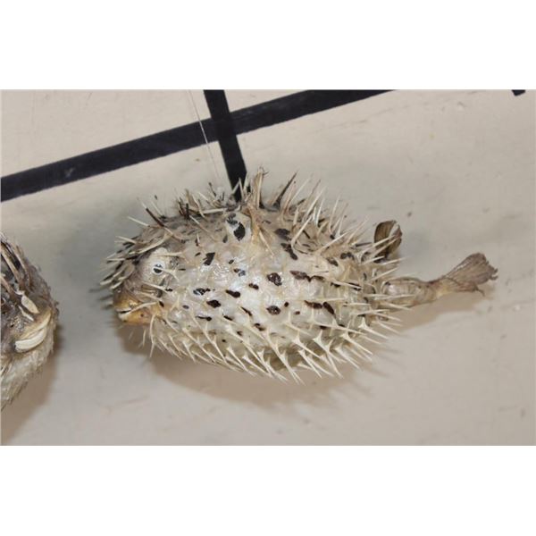 2 BALLOONFISH aka Long-spine PORCUPINE FISH with google eyes and ceiling hangers (ONE$). The Balloonfish is a member of the family Diodontidae, the spiny puffers. This fish along with its close relatives, has the ability to inflate its body by taking water or air into portions of its digestive track, increasing its diameter size as much as 3 times. When the body expands, long spines that normally lie flat on the body are erected, not only adding to the size but also creating a formidable weaponry to discourage attack by predators. (ONE$) TAXIDERMY FISH