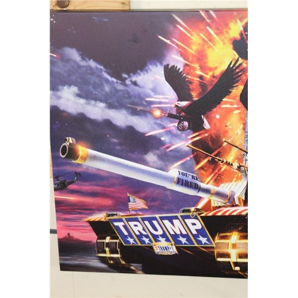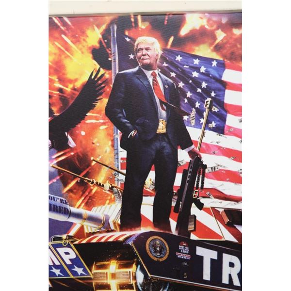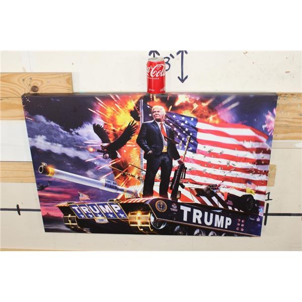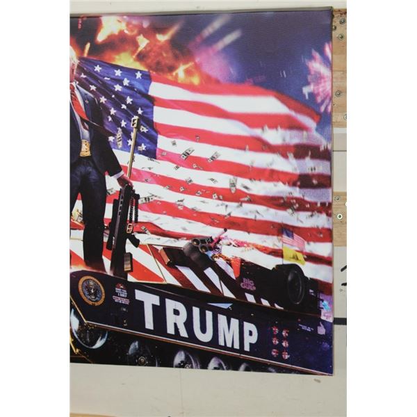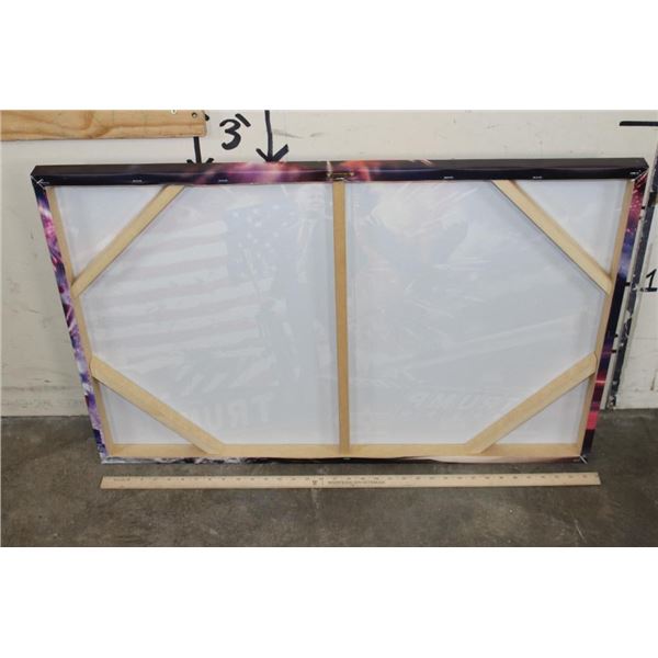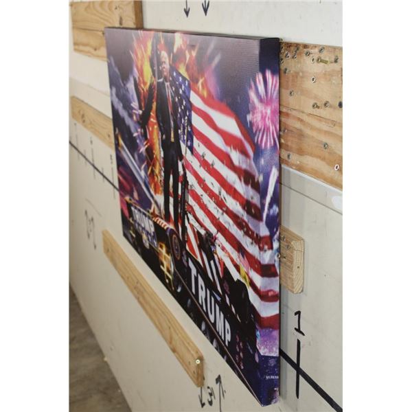 President Donald Trump Patriotic Canvas Printed and wrapped onto a wood frame. It measures 3' Wide x 2' Tall. The next Lot is a matching patriotic canvas of Ronald Reagan. PATRIOTIC ART PRINTS