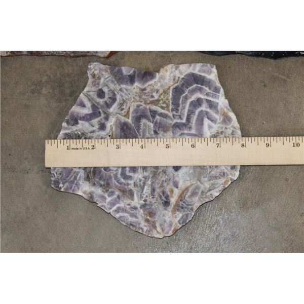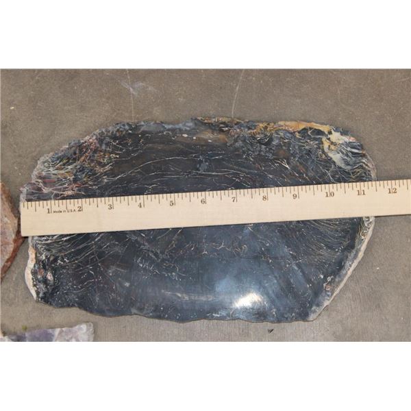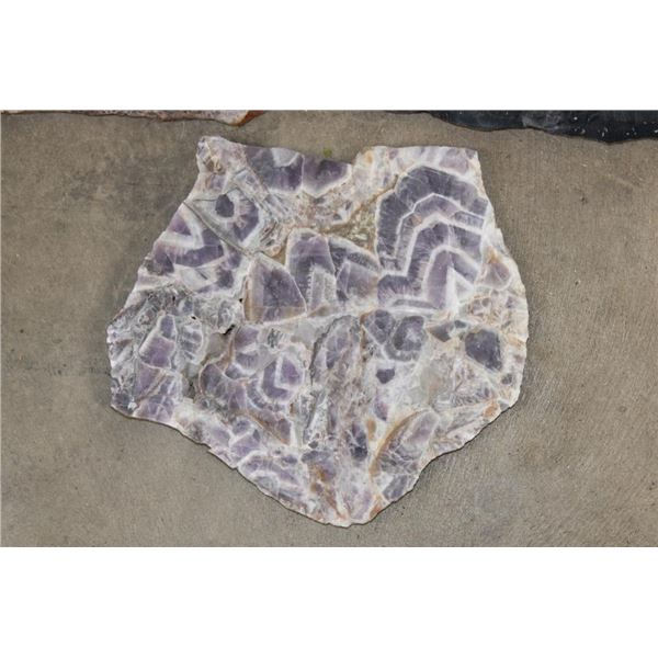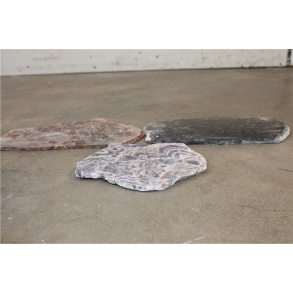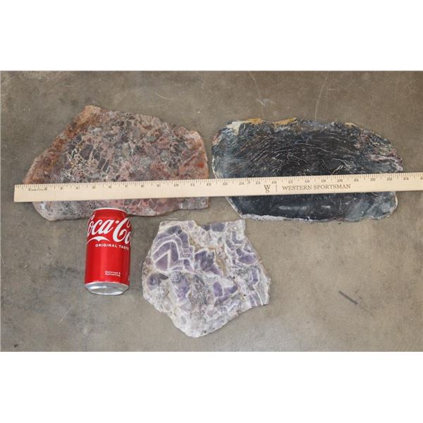 3 Mineral Slab Slices. There is 1 Brecciated Jasper, 1 Petrified Fossilized Wood, and 1 Dream Amethyst Mineral Slice. The Total Weight is 5 lbs. (ONE$) ROCKS FOSSILS MINERALS