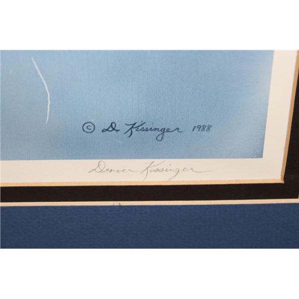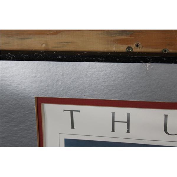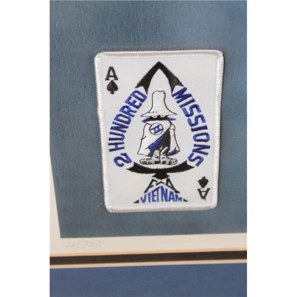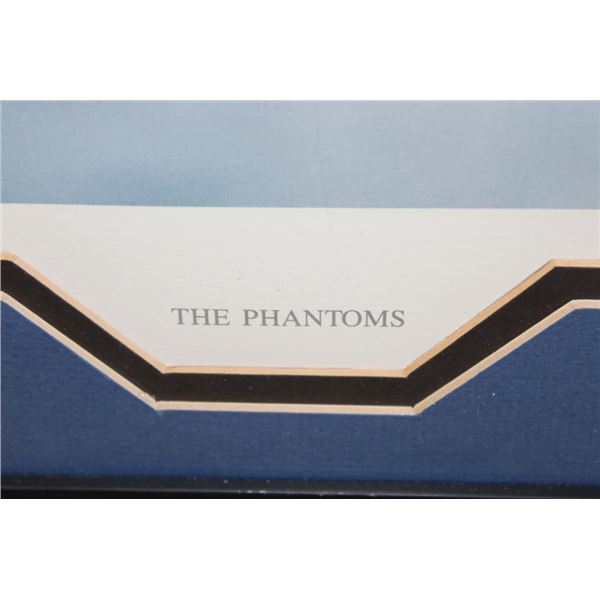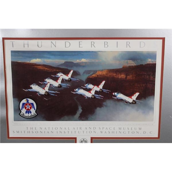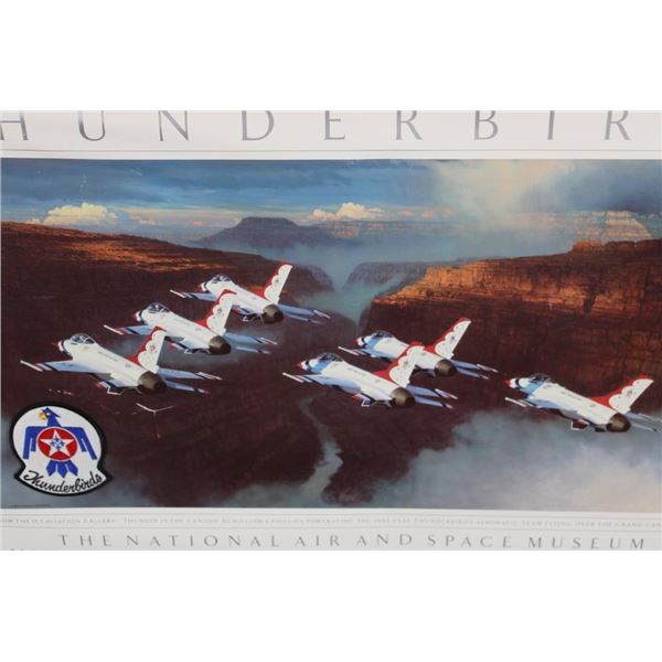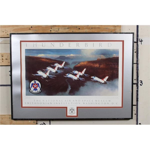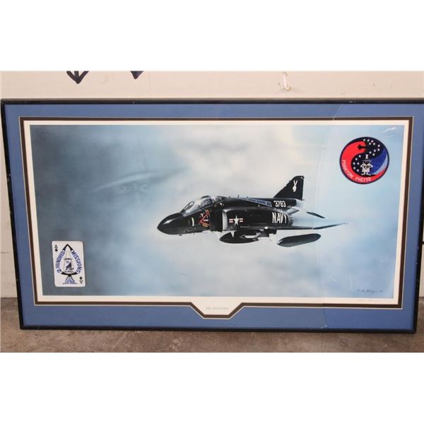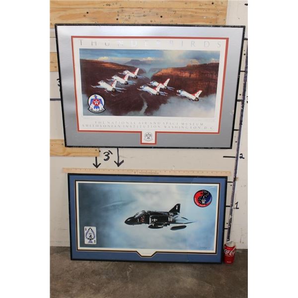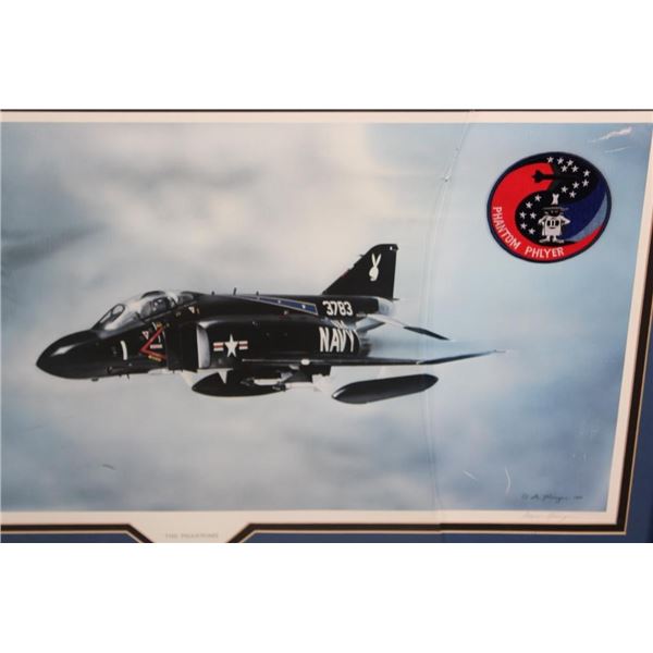 2 Framed Aviation Art Prints. "The Phantoms" by Denver Kissinger 1988. It has been signed by the artist and numbered 12/150. It is in a metal frame that measures 20 1/8" Tall x 34" Wide (it will need a new frame, the glass has been broken). It has 2 patches-"2 Hundred missions Vietnam" and "Phantom Phlyer". The other art print is "Thunder in the Canyon" Art Print by artist William S. Phillips 1986. It portrays the 1985 USAF Thunderbirds aerobatic team flying over the Grand Canyon in F-16s. The metal frame measures 24" Tall x 34" Wide. (ONE$) COLLECTIBLE AVIATION ART