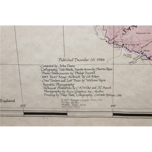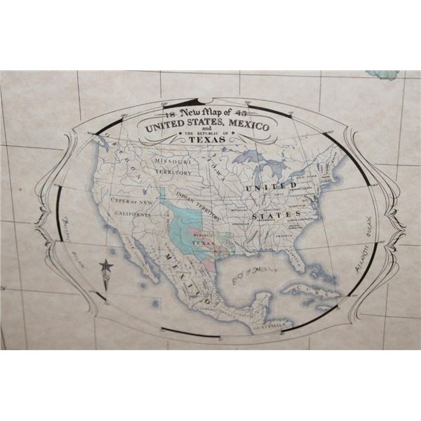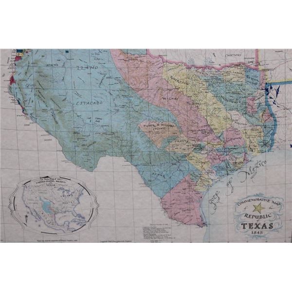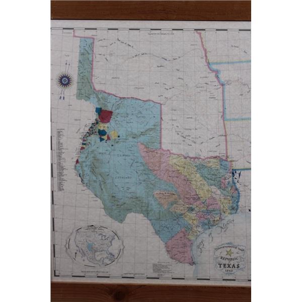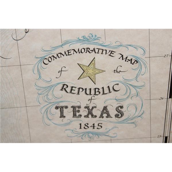 Commemorative MAP "The Republic of Texas-1845" from 1987. It is displayed in a 38.5" Tall x 32" Wide natural wood frame with glass. COLLECTIBLE MAPS