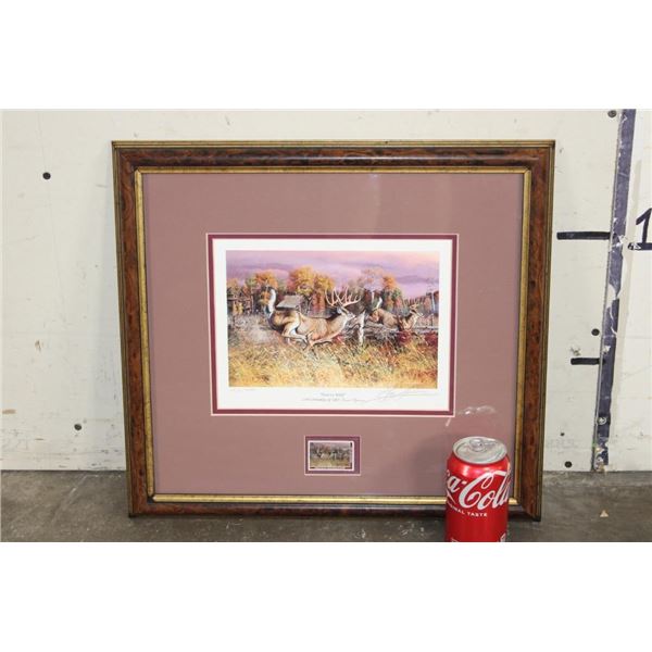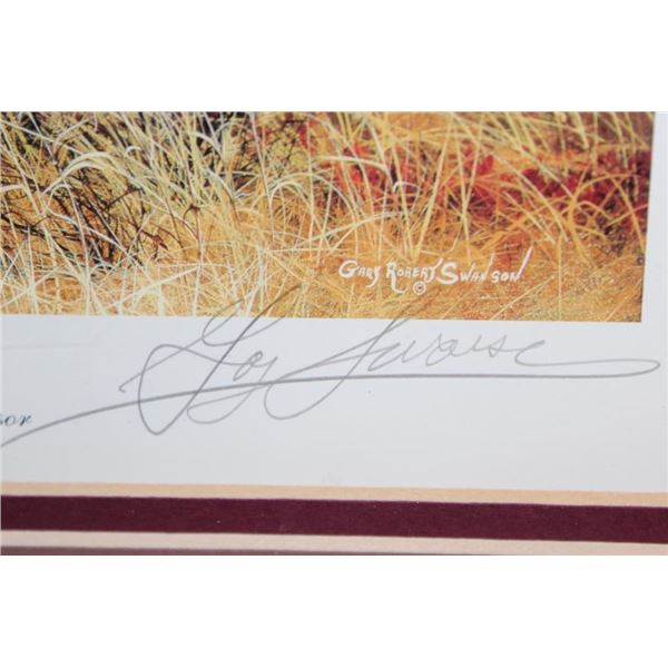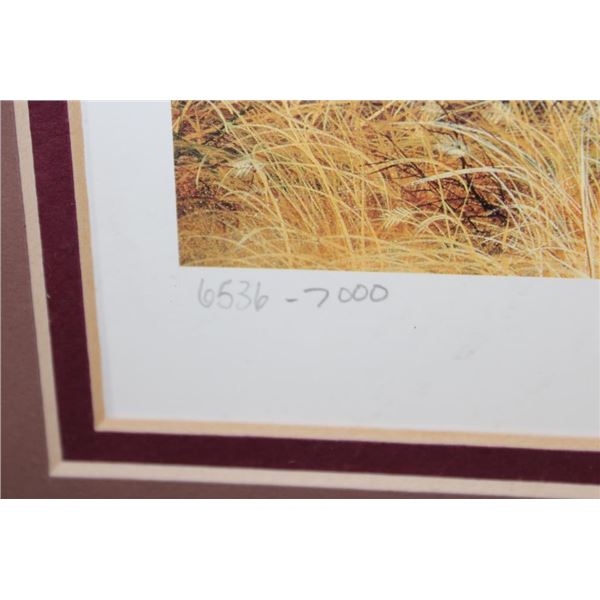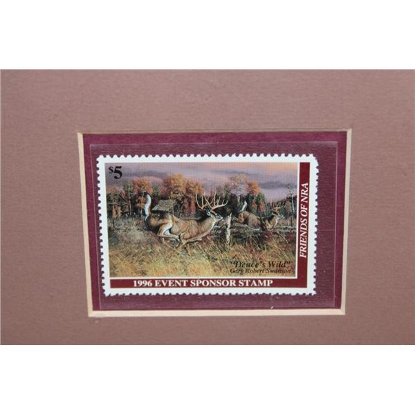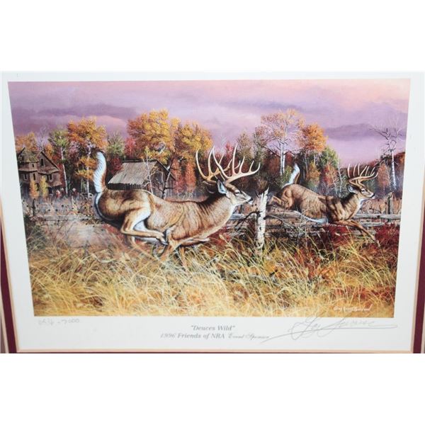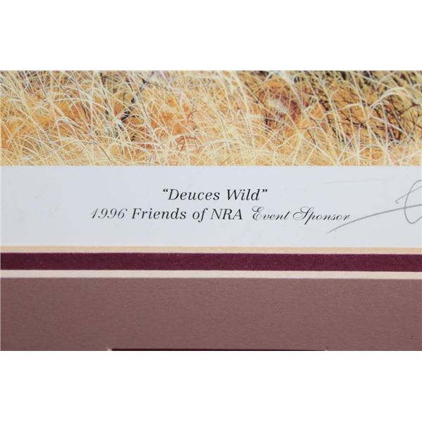 "Deuces Wild" 1996 Friend of the NRA Print with the 1996 Event Sponsor Stamp. It has been signed and numbered #6536/7000 by Gary Robert Swanson. It is in an 17" Tall x 18" Wide wood and glass frame. COLLECTIBLE WILDLIFE ART