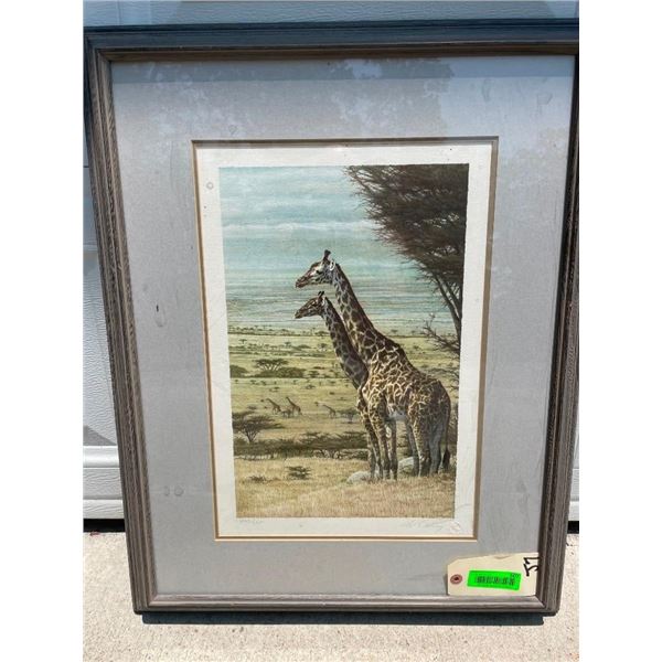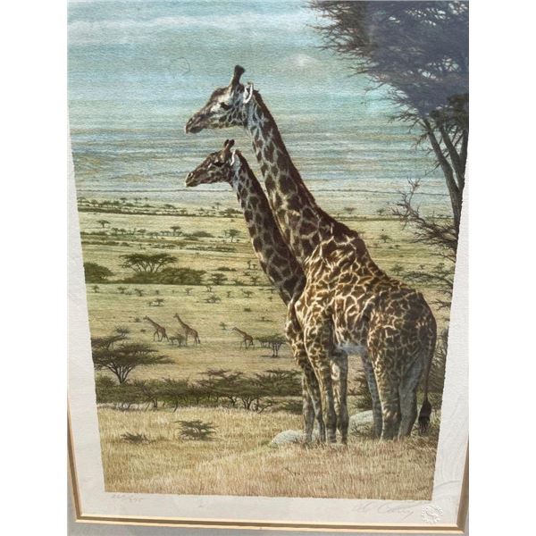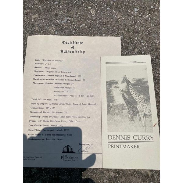Beautiful Mylar Lithograph "Kingdom of Dreams" Signed by artist "Dennis Curry" and Numbered "260/375". It comes with a Certificate of Authenticity. Dennis Curry thoughts on the piece- "After finding an old giraffe skull at this place overlooking the Serengeti, the image came to me through a series of dreams." The Lithograph measures 11" x 17" inside the wood frame. COLLECTIBLE AFRICAN ART
