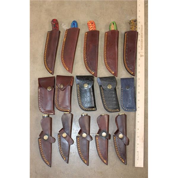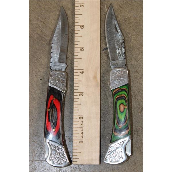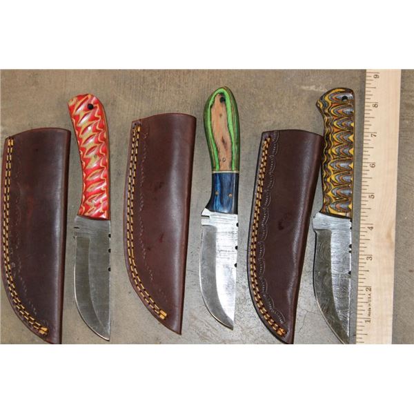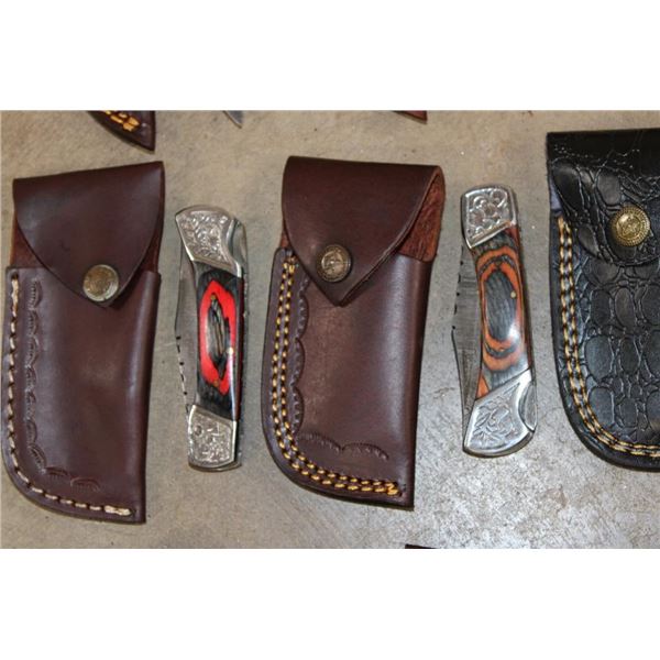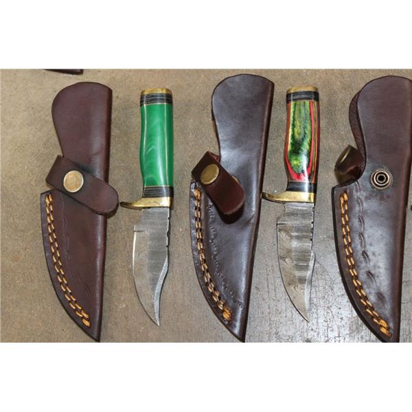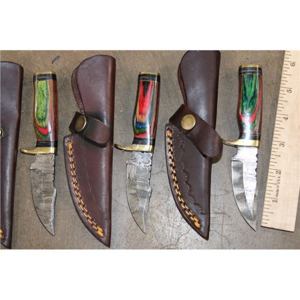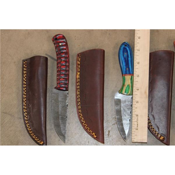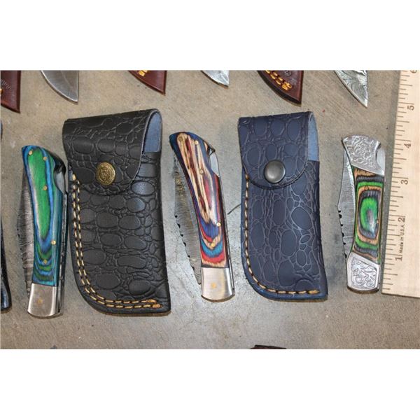 15 *New* Damascus Steel Blade KNIVES with custom Leather Sheaths. There are 5 smaller Fixed Blade Knives that measure approx. 6" Long each, 5 bigger Fixed Blade Knives that measures approx. 8.5"Long each, and 5 Pocket Knives with locking blades that measure approx. 7" Long each (when open). They mostly have colorful Wooden Handles and some have Resin Handles. (ONE$) KNIVES