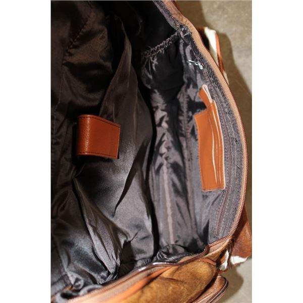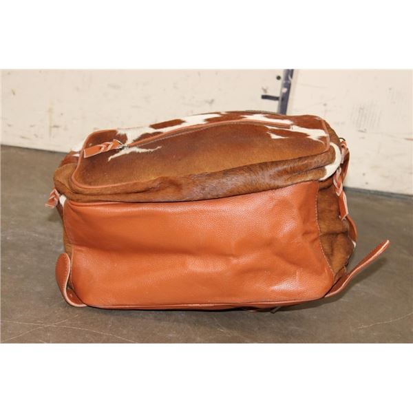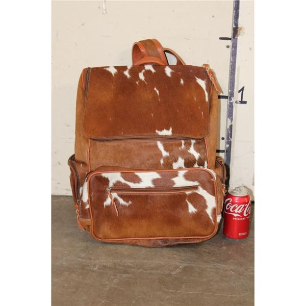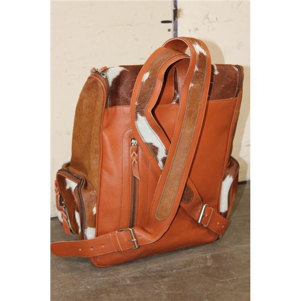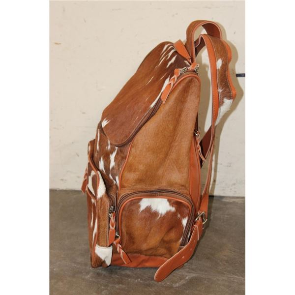 *Brand New* COW HIDE and Leather Backpack with a Laptop Compartment. It has a gorgeous speckled colorway and lots of pockets for storage. It measures 17" Tall x 15" Long x 8" Wide. WESTERN BACKPACKS AND BAGS